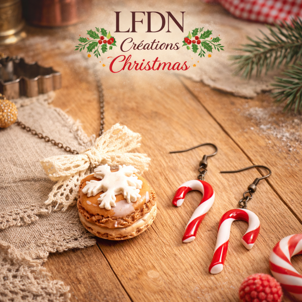 Plongez dans la magie des fêtes avec cette adorable parure macaron de Noël, composée d’un collier macaron décoré d’un flocon de neige et de boucles d’oreille sucres d’orge 🍬❄️
