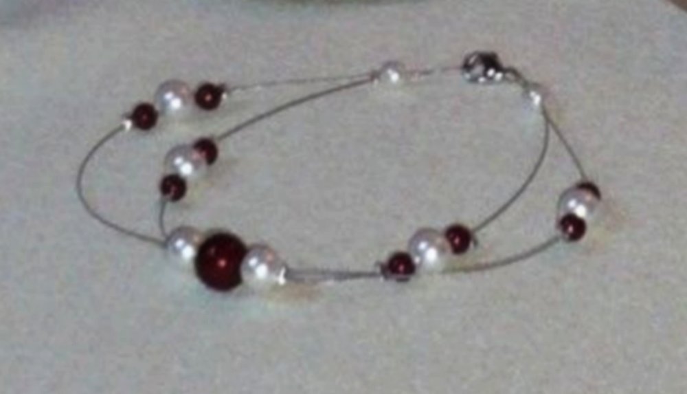 Fabriqué à la main, les bijoux sont surtout fait avec du fil câblé ou nylon, les perles sont en cristal de swarovski, verre de bohème.