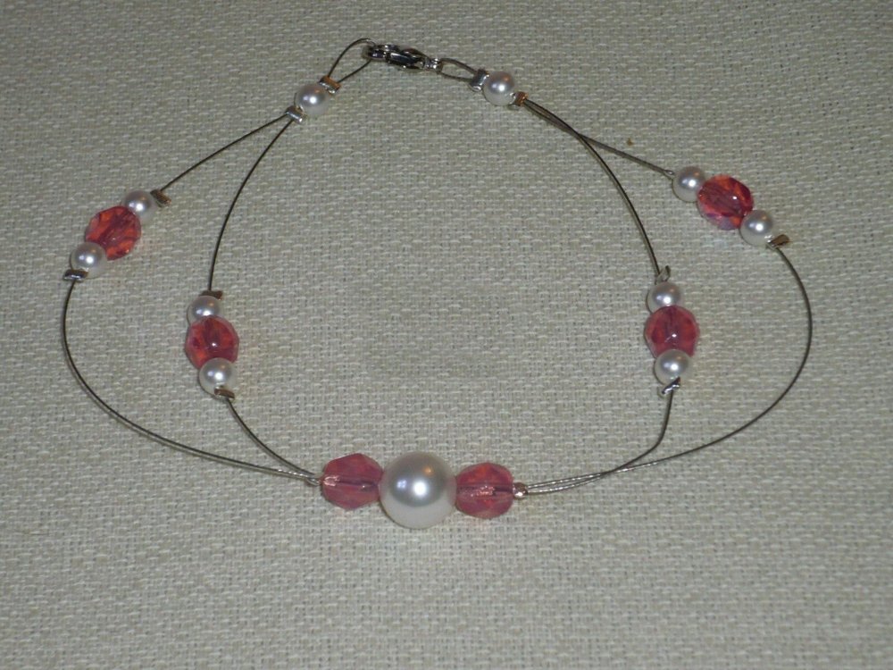 Fabriqué à la main, les bijoux sont surtout fait avec du fil câblé ou nylon, les perles sont en cristal de swarovski, verre de bohème.