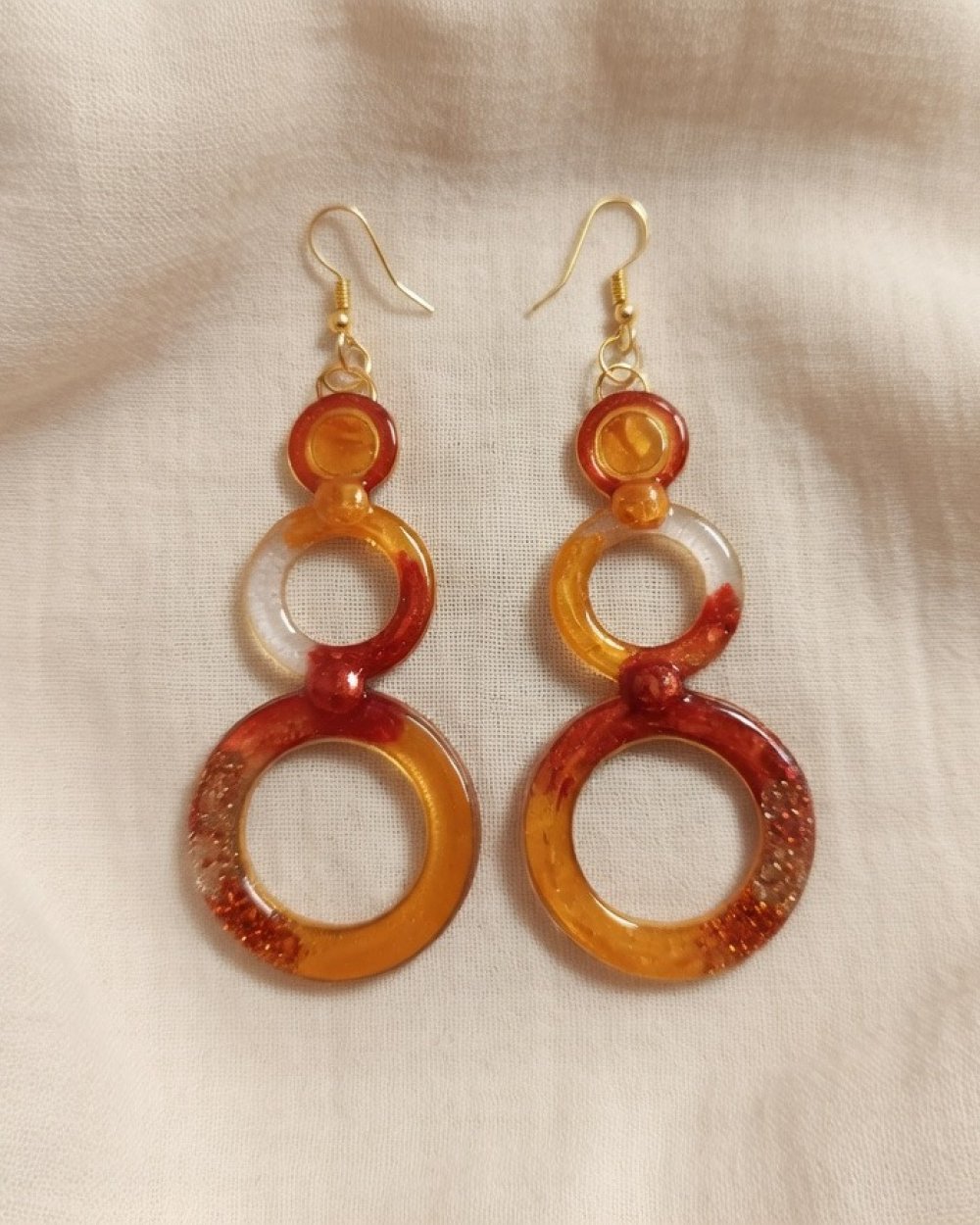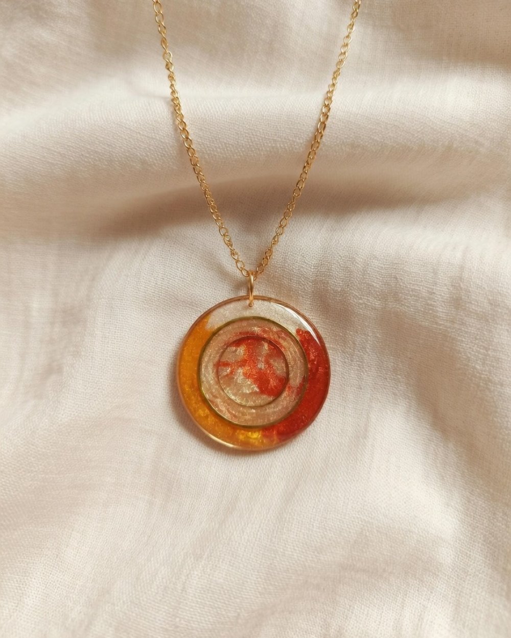 Le pendentif reprend les mêmes nuances ambrées et flamboyantes que les boucles d'oreilles.