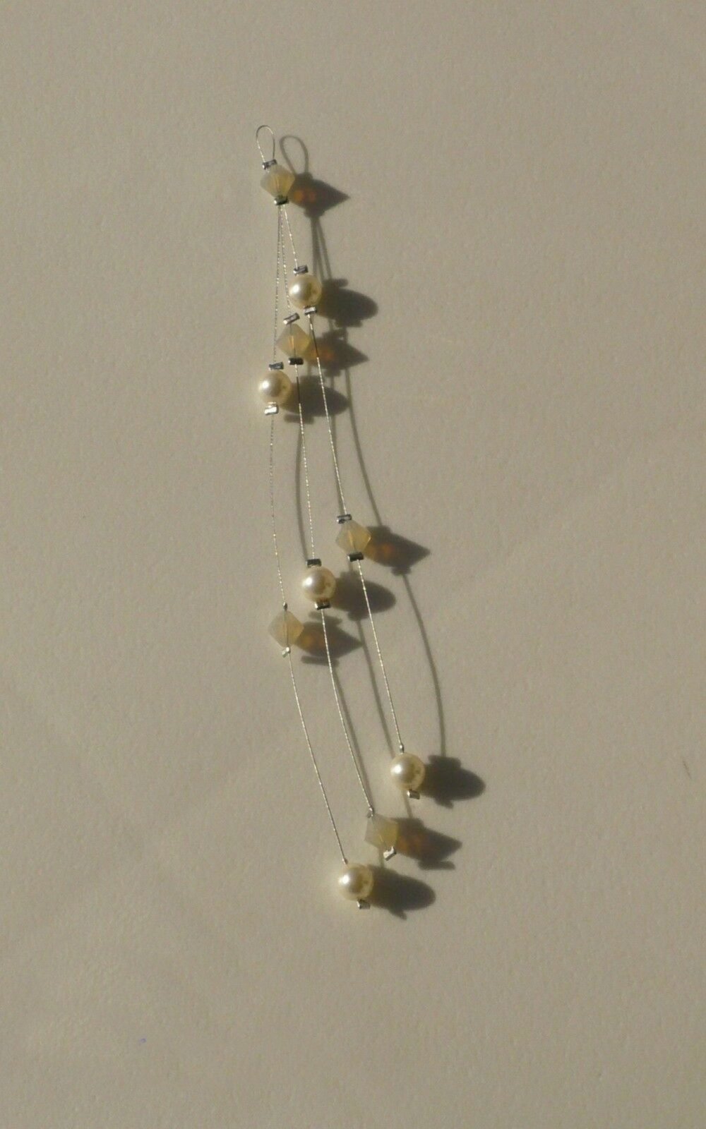 Composé de ronde nacré 6, 8 mm et de toupie 6 mm en cristal de swarovski, sur fil câblé argenté, sans nickel.