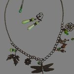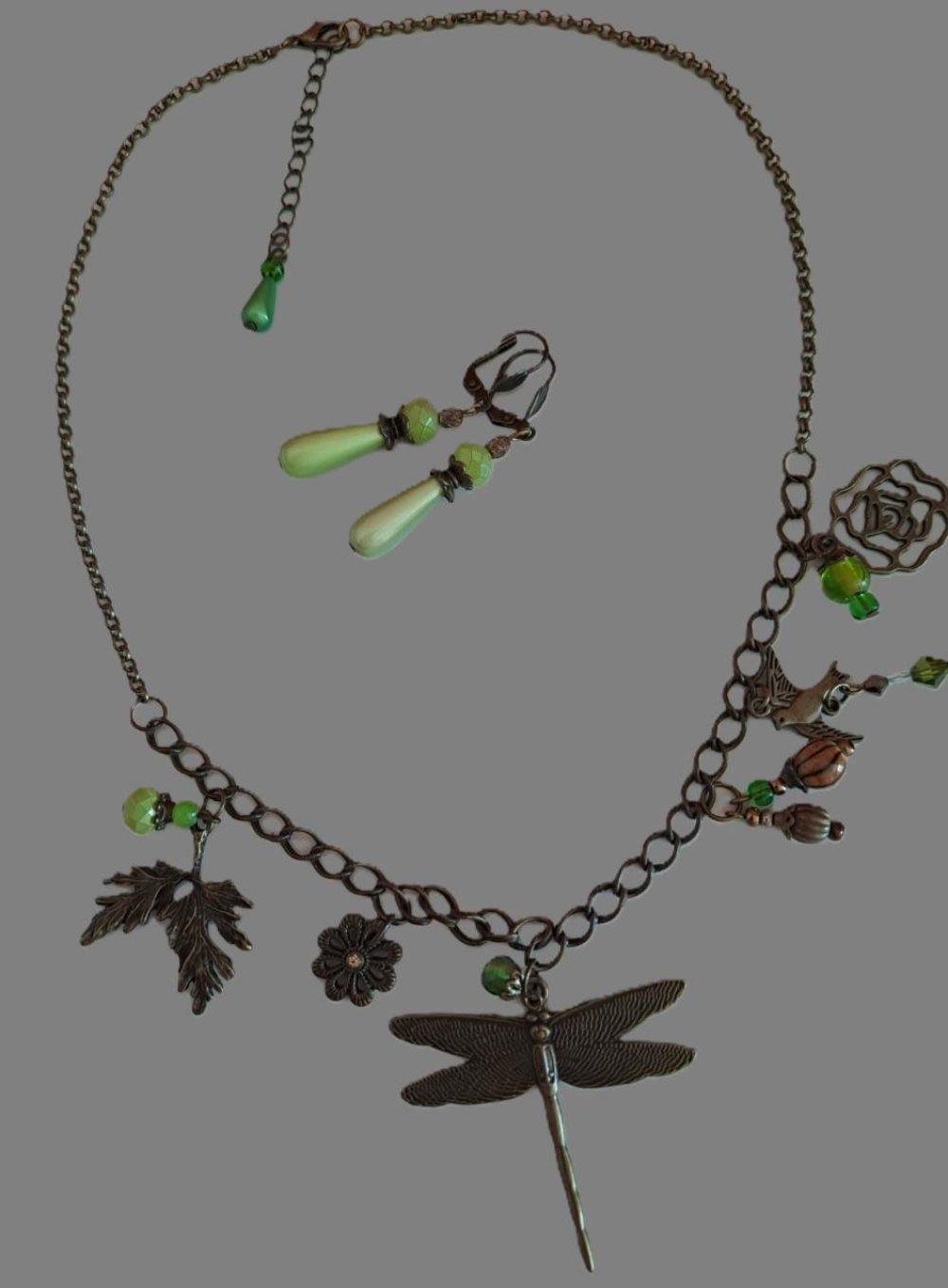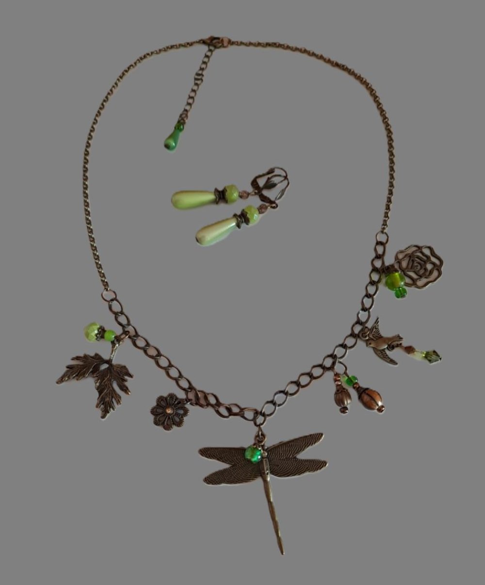 Parure "Libellule" - style art déco composée d'un collier sur lequel est fixée une libellule et des breloques de couleur bronze ainsi que des breloques en verre.