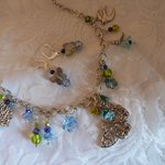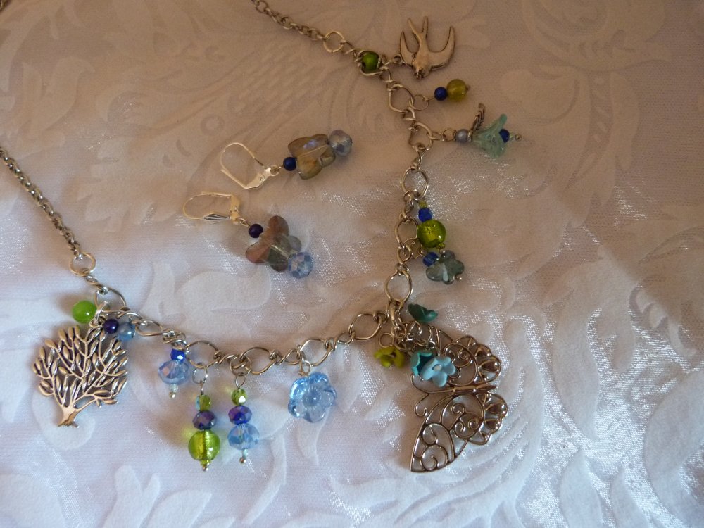Les perles de verre et cristal de Swarovski (papillon) se déclinent dans des tons de vert et bleu.