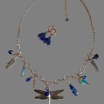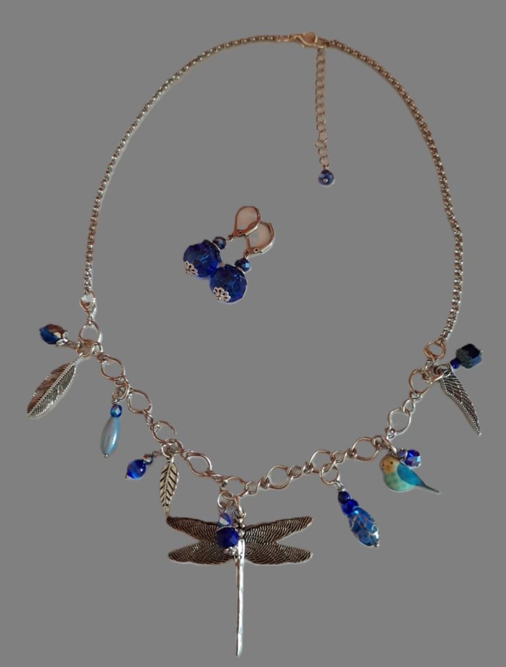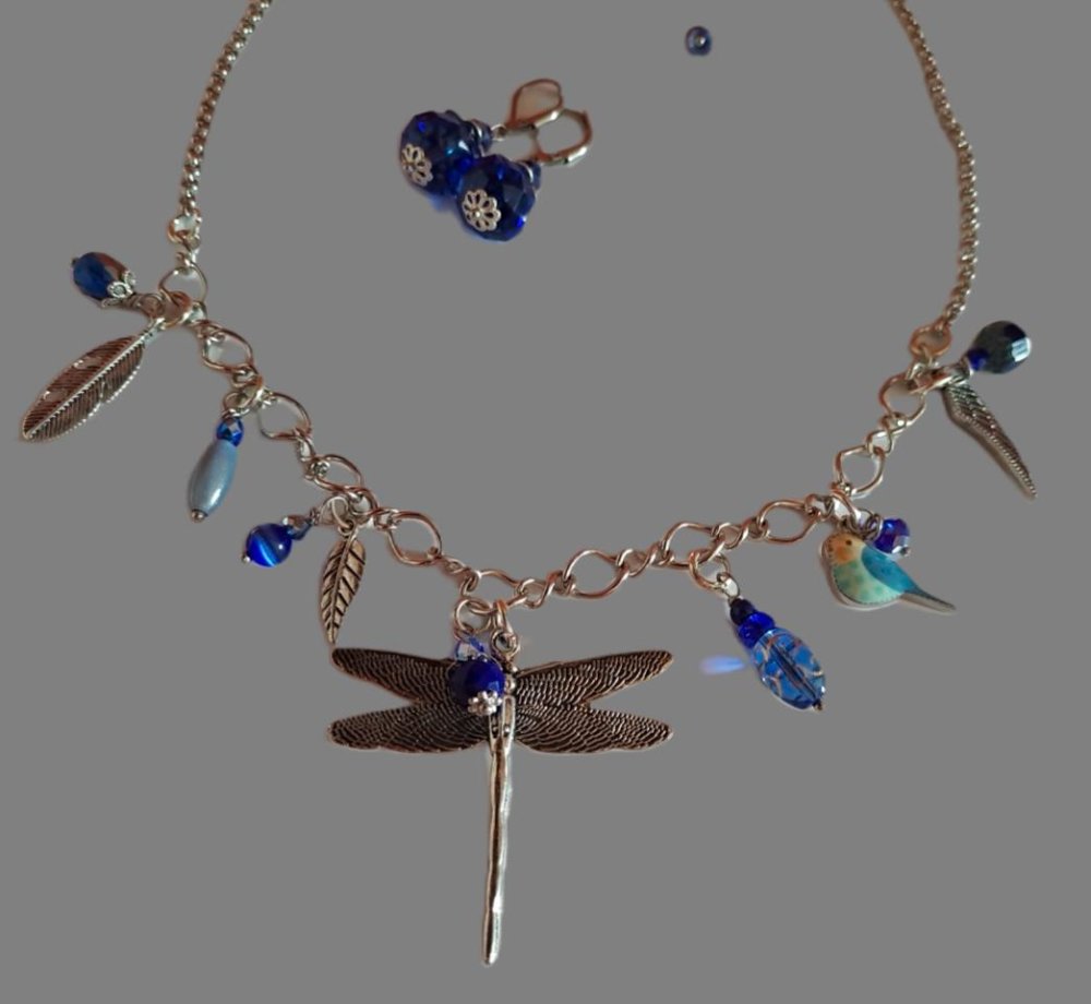 Parure "Libellule" - style art déco composée d'un collier en métal argenté sur lequel est fixée une libellule et des breloques argentées ainsi que des breloques en verre.