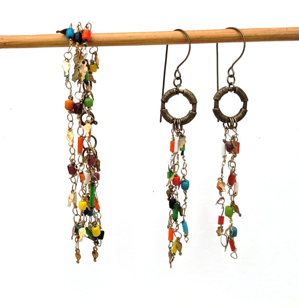 - le bracelet : il est composé de 3 rangs de pampilles bronze et petites perles tribales en verre multicolores