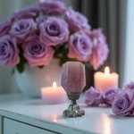 Porte bougie, photophore vintage mauve marbré sur pied fleur argent