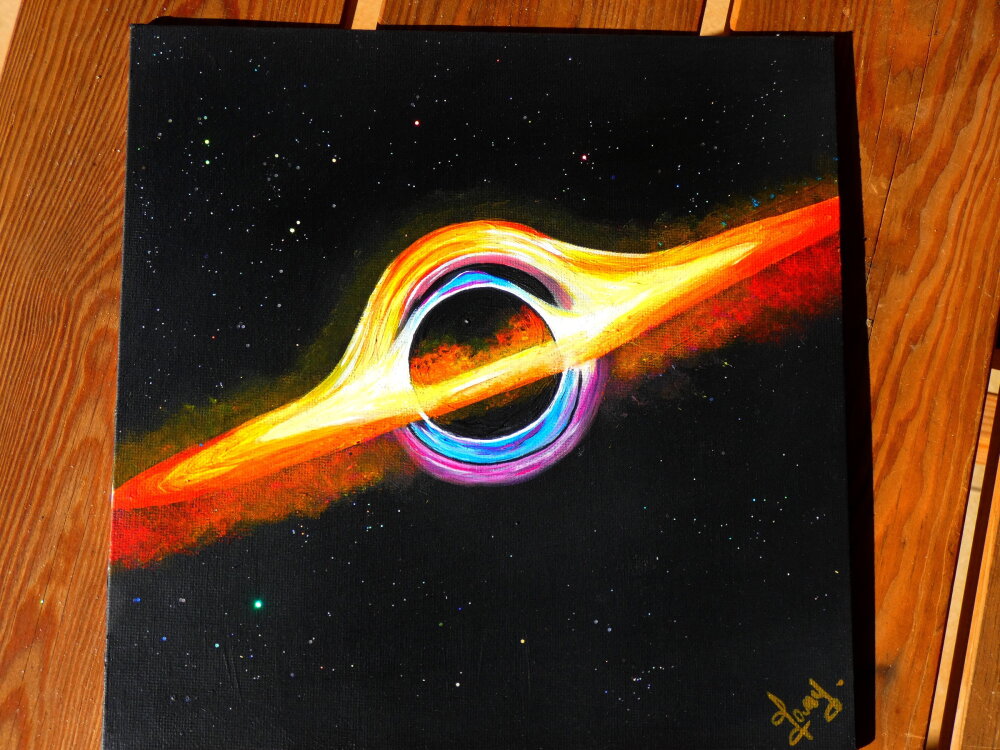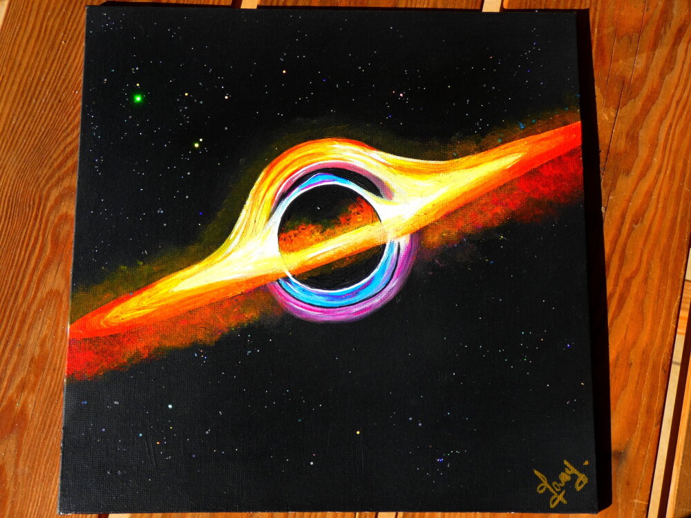 Depuis toute petite je suis passionnée par les cosmos, ses nébuleuses, ses trous noirs...J'ai donc choisi parmi le web une photo d'un trou noir extrêmement lumineuse et ultra colorée pour la reproduire en peinture. Sur la dernière photo vous avez la photo réelle du trou noir