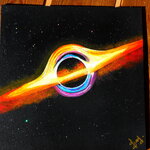 Je vous propose une peinture carrée de 25 cm x 25 cm que j'ai réalisée sur un carton toilé apprêté 2 fois sur lequel j'ai reproduit d'après une photo scientifique, un trou noir Massif.