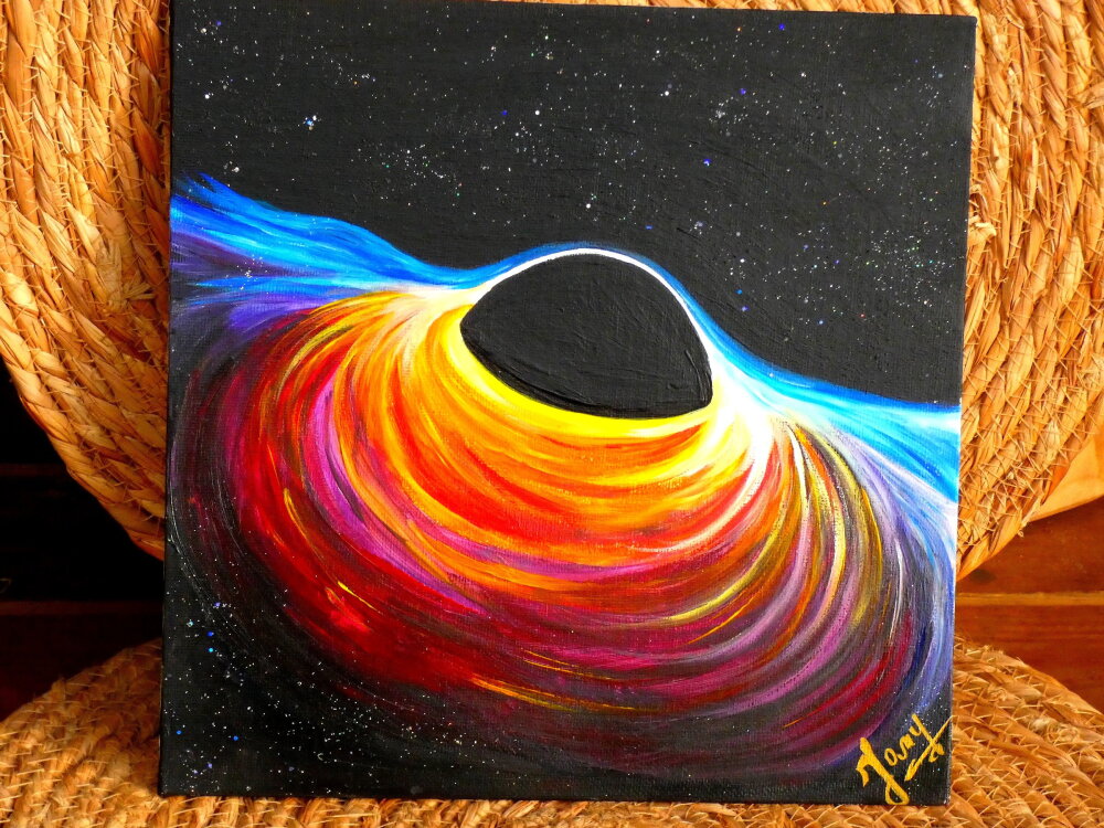 Depuis toute petite je suis passionnée par les cosmos, ses nébuleuses, ses trous noirs...J'ai donc choisi parmi le web une photo d'un trou noir extrêmement lumineuse et ultra colorée pour la reproduire en peinture. Sur la dernière photo vous avez la photo réelle du trou noir