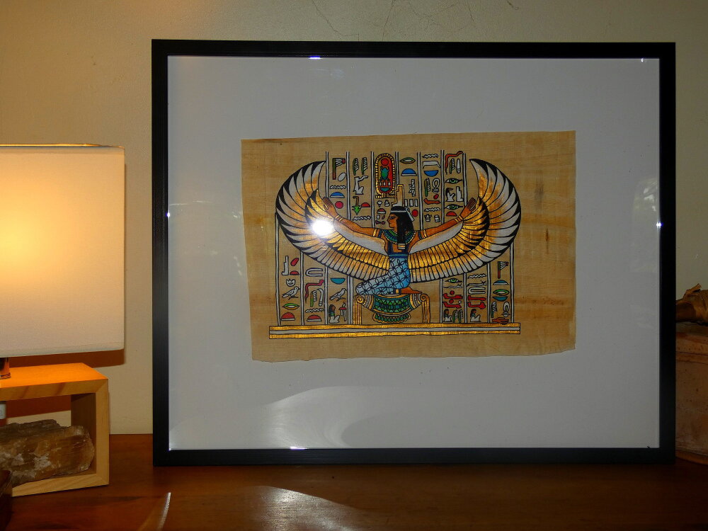 Cette peinture a été entièrement réalisée à la main par mes soins sur une véritable feuille de papyrus que je me suis procurée auprès d'un vendeur Egyptien.