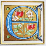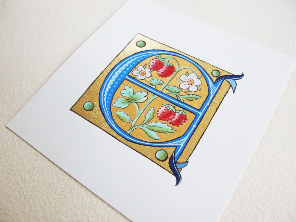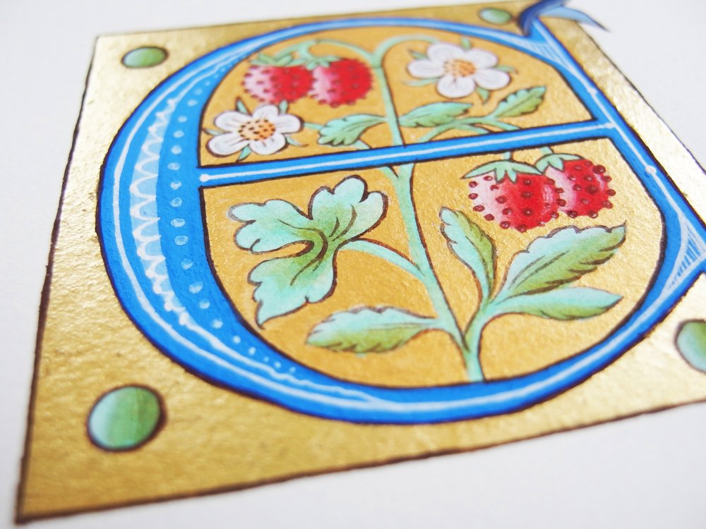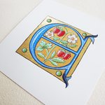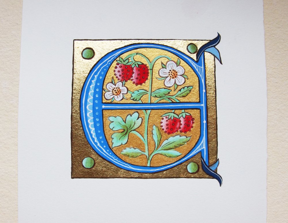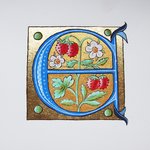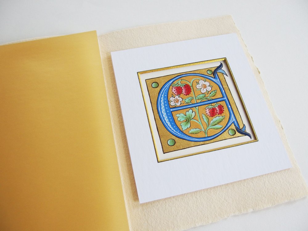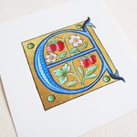 Enluminure, Lettrine E, Enluminure sur Papier, Lettrine Initiale E, Elumlnure Originale, Enluminure Or Véritable et Pigments, Enluminure Renaissance, Enluminure 16Eme Siècle