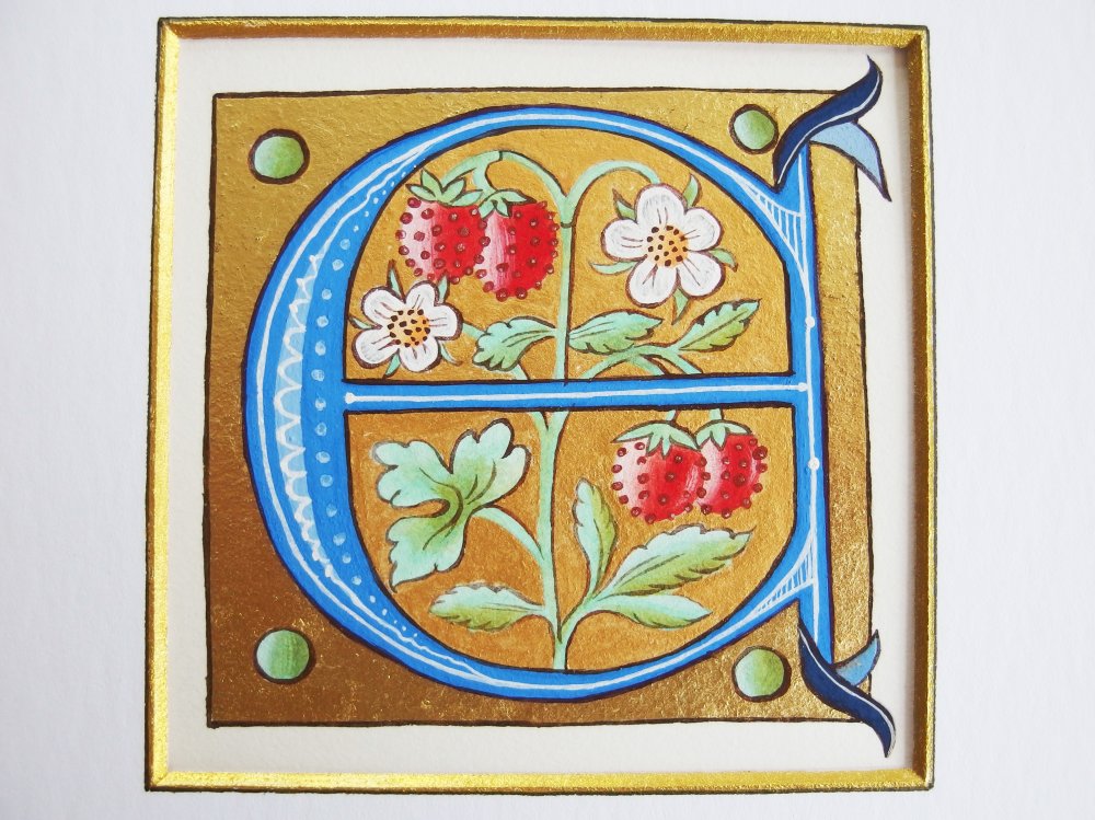 Sujet : Lettre E, agrémentée de fraises et fleurs de fraisiers. Beaucoup de fraicheur dans cette illustration.