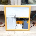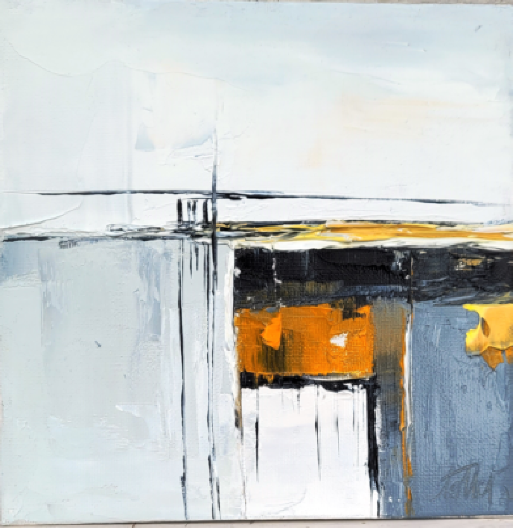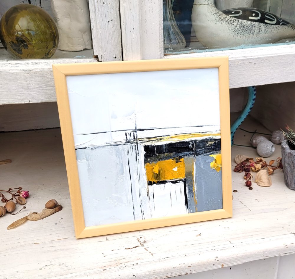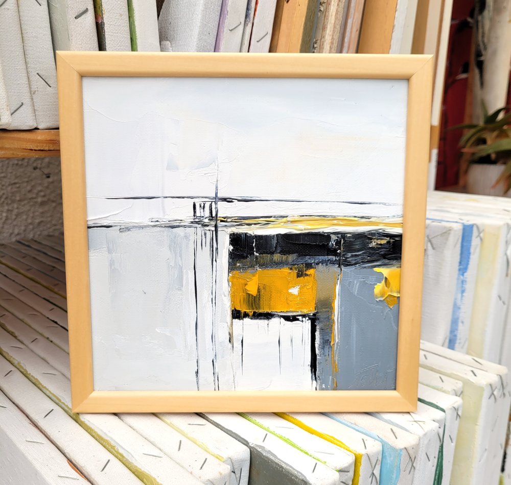 "Evocation Sensible": Peinture abstrait lyrique à l'huile au couteau sur carton entoilé avec cadre .: dimensions de la toile = 20/20 cm ou 8/8 inches. ; avec le cadre = 22/22 cm ou 8.8/8.8 inches.