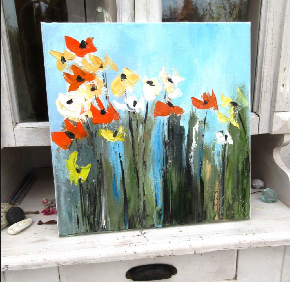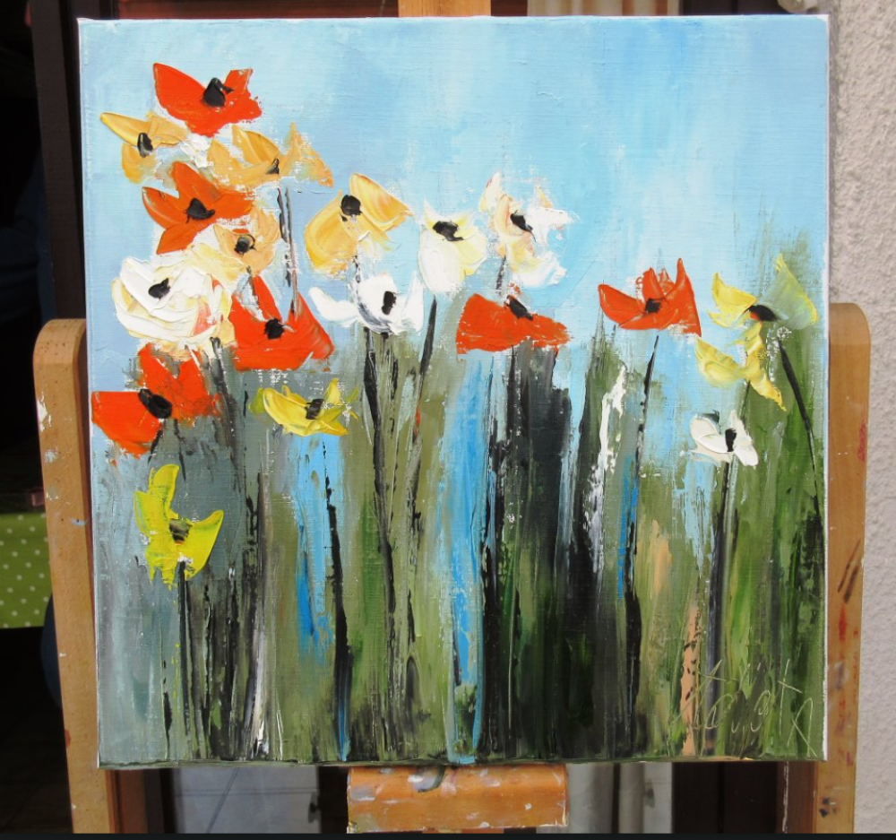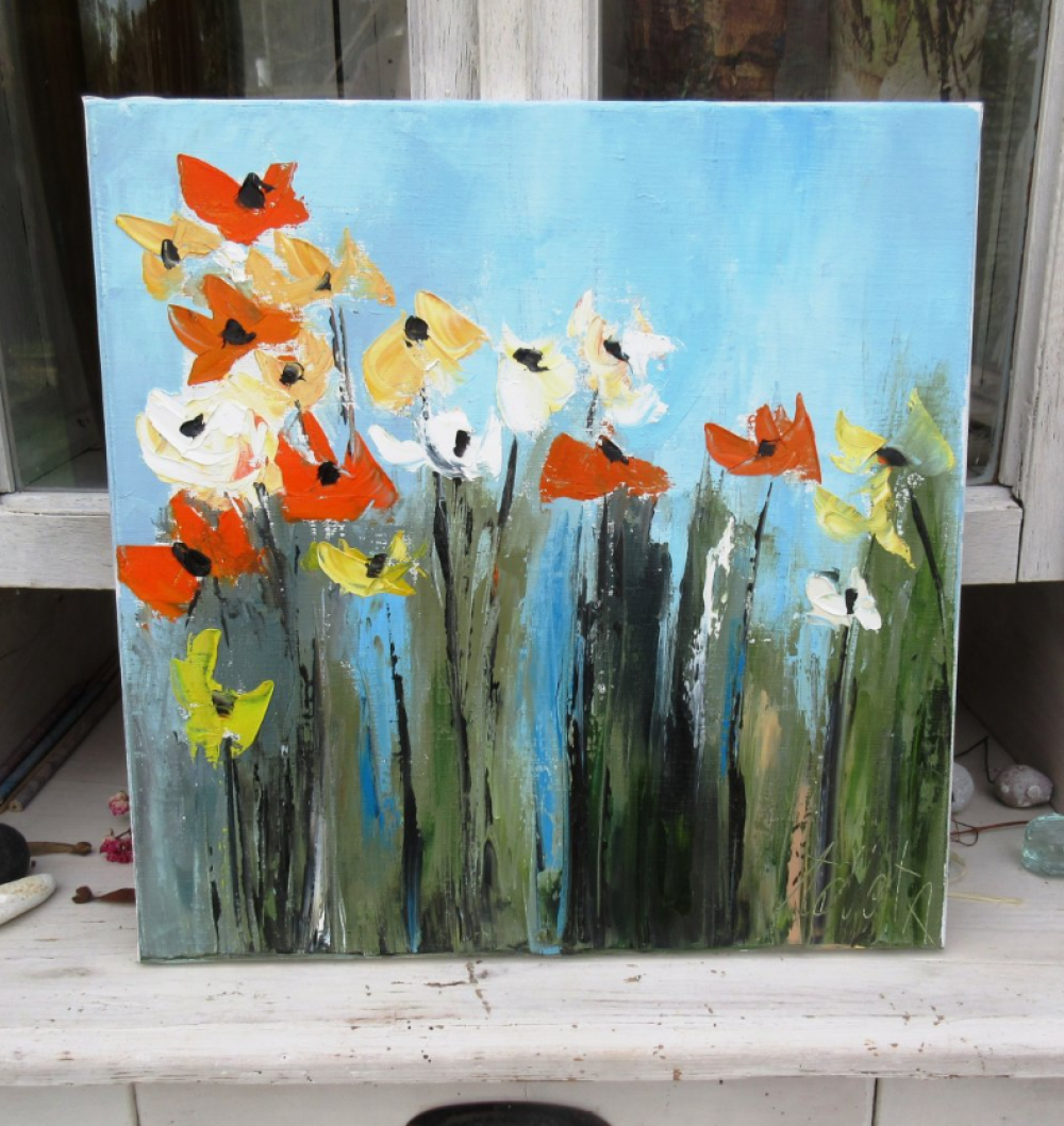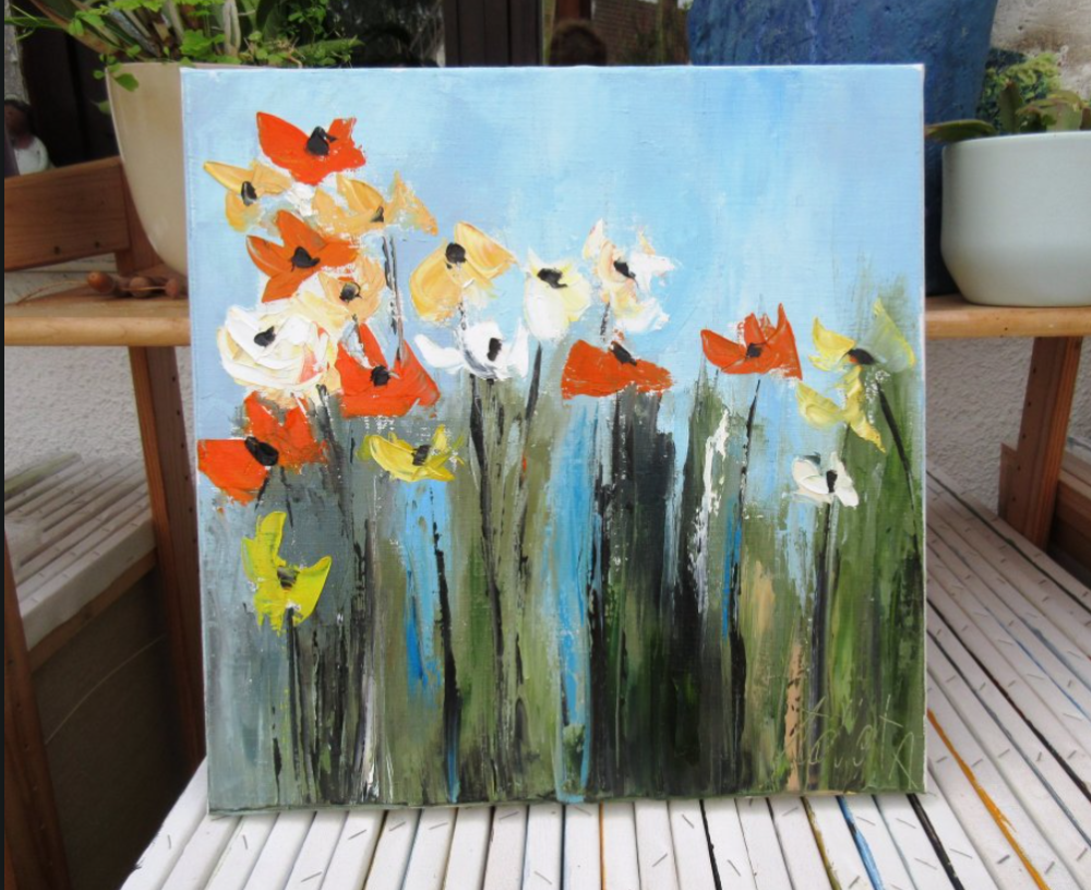 Peinture figurative florale : "Faire Rêver Le Réel " ...fleurs des champs: peinture à l'huile au couteau sur toile de lin : dimensions = 40/ 40 cm ou 16/ 16 inches. La dernière photo montre les côtés de la toile= agrafes.