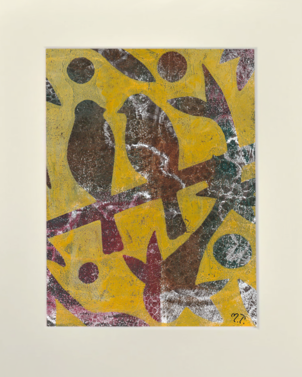 œuvre d'art originale et entièrement unique de ma série "Les Oiseaux". Monotype d'impression sur plaque de gel, marouflée sur carton avec passe partout couleur