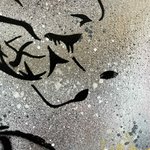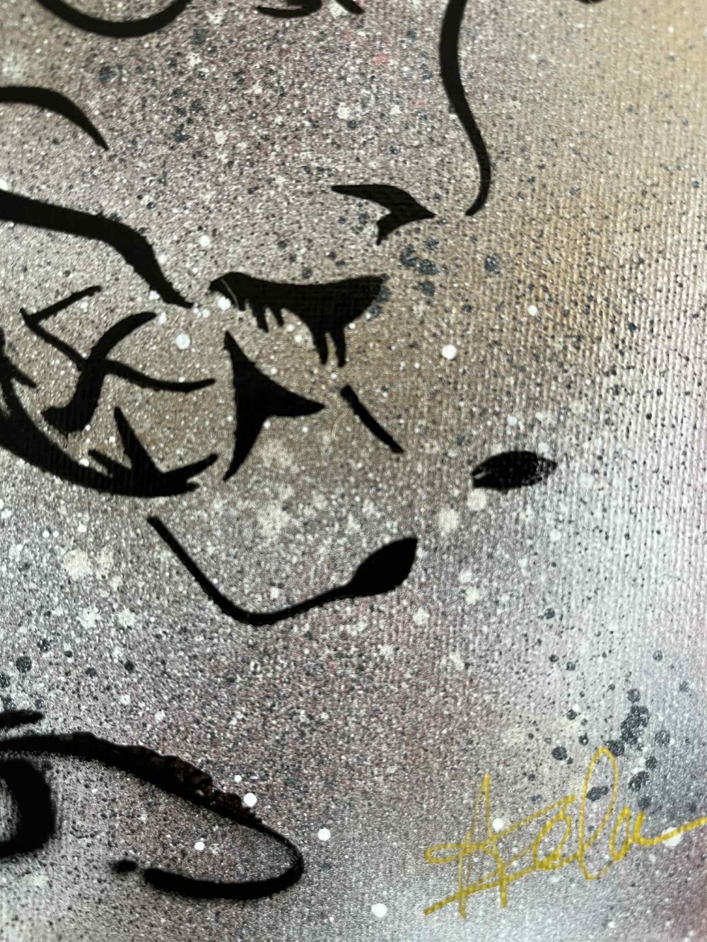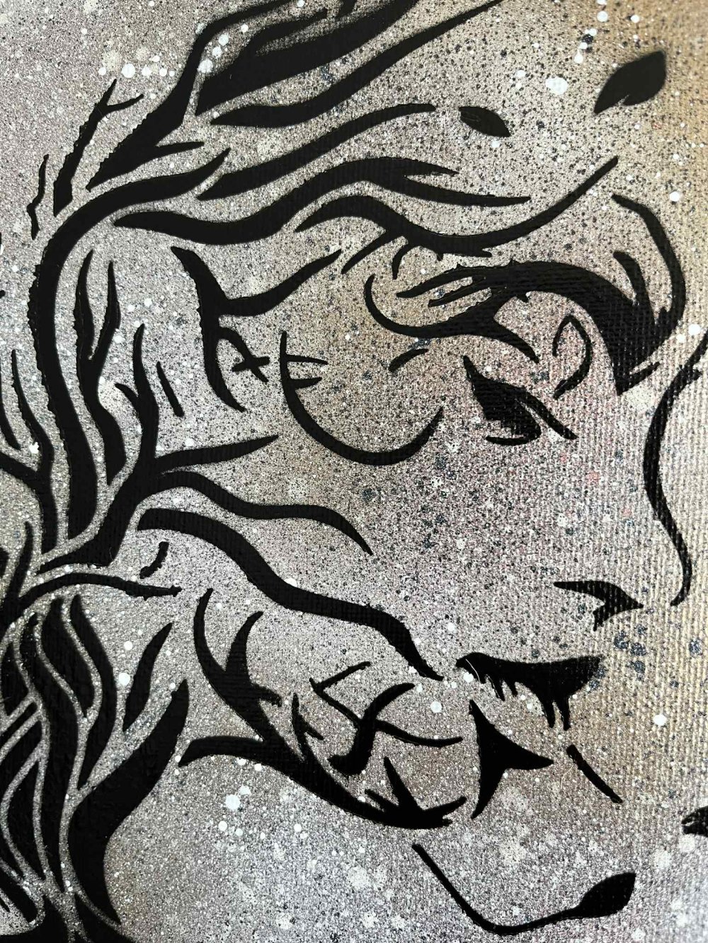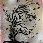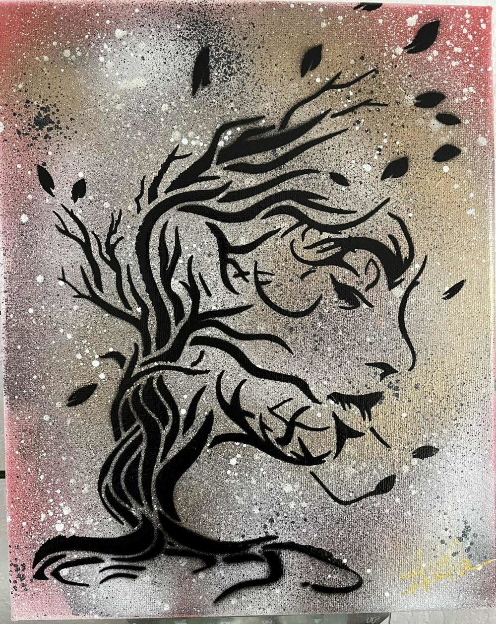 Cette peinture signée Azela capture la poésie d’un visage-arbre, fusion délicate entre l’humain et la nature. Le fond, travaillé à la bombe, offre une texture vaporeuse aux éclaboussures blanches, comme un ciel d’automne traversé de vent. Le pochoir noir, à la fois précis et organique, dessine un visage dont les lignes se transforment en branches et en feuilles. Certaines s’envolent, d’autres s’accrochent encore, métaphore du temps qui passe et des émotions qu’on laisse partir. Chaque détail traduit la recherche d’équilibre entre force et légèreté, maîtrise et liberté. “Souffle de l’âme” évoque la transformation, la renaissance et l’harmonie entre la nature et l’âme.