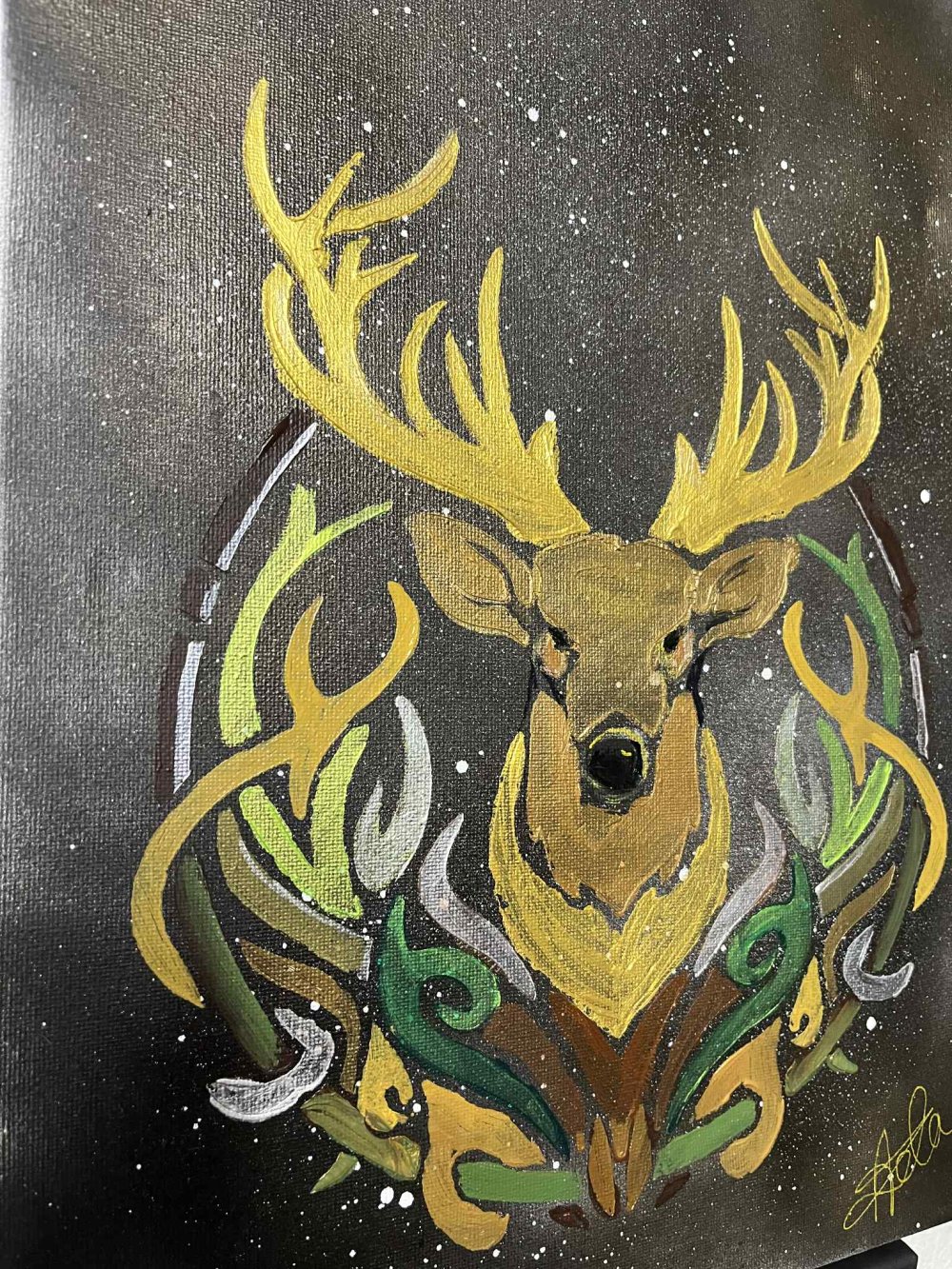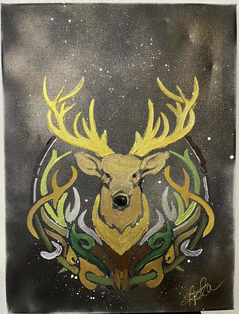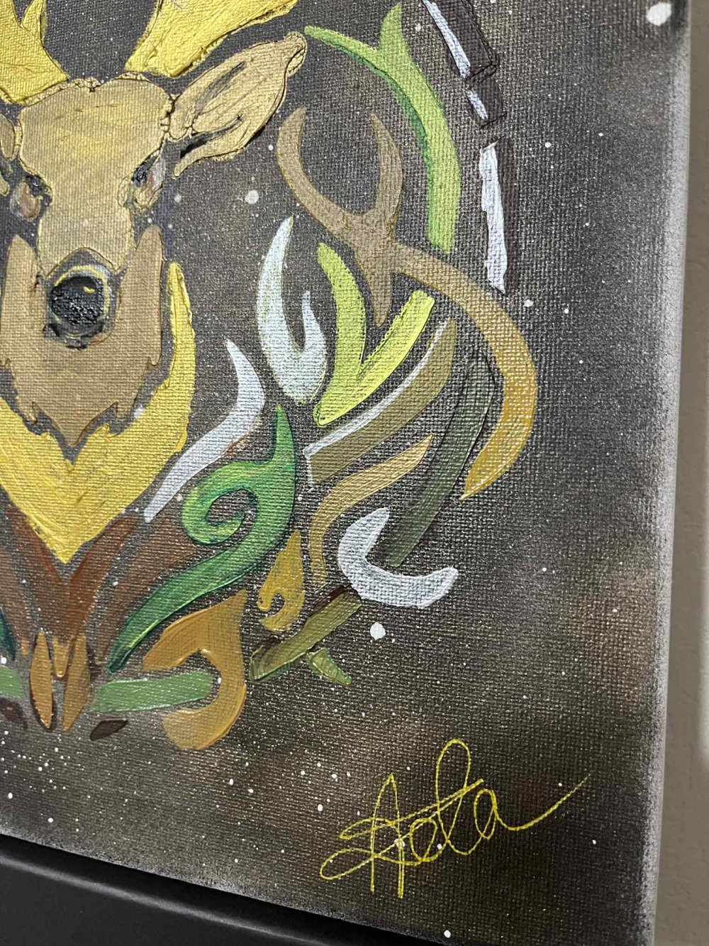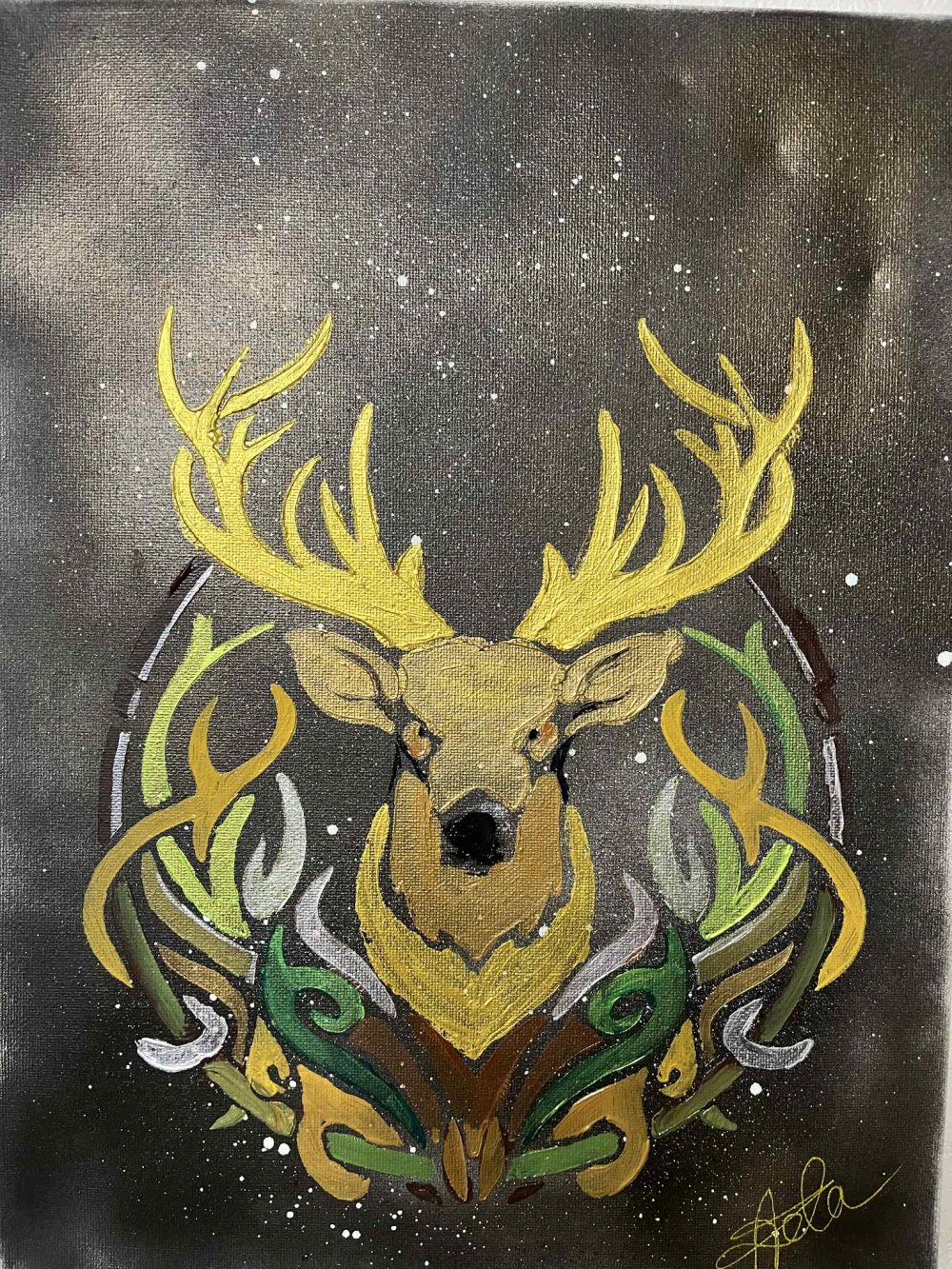 Une œuvre vibrante représentant un cerf majestueux, symbole de force et de sagesse, entouré de motifs végétaux inspirés de la nature et de l’énergie de la forêt. Peinte à l’acrylique et rehaussée de détails dorés, cette toile évoque la connexion entre le monde animal et le spirituel.