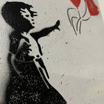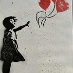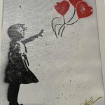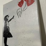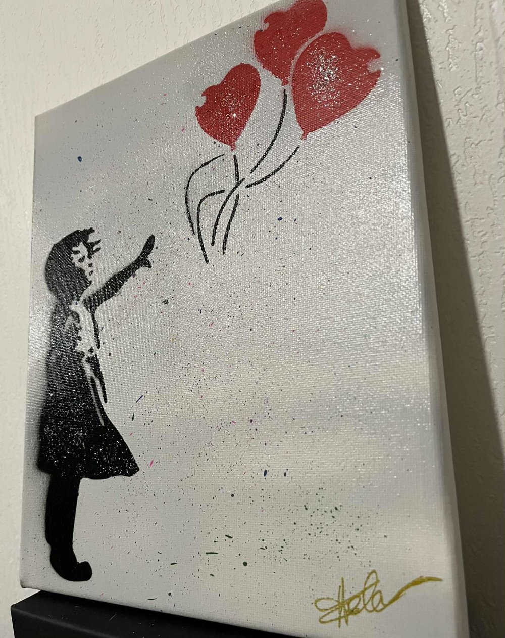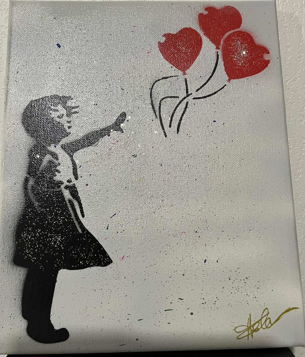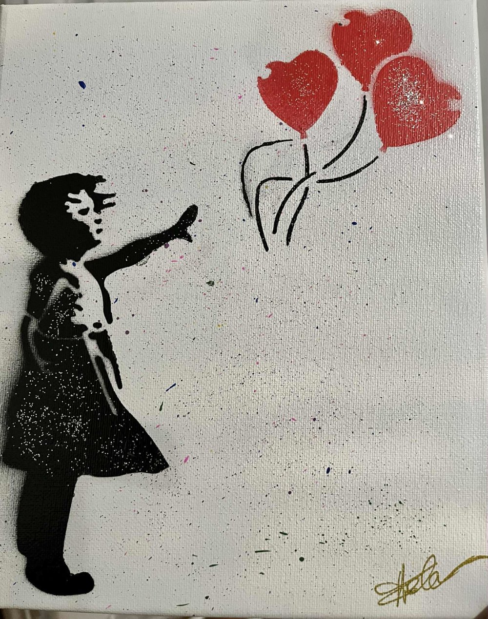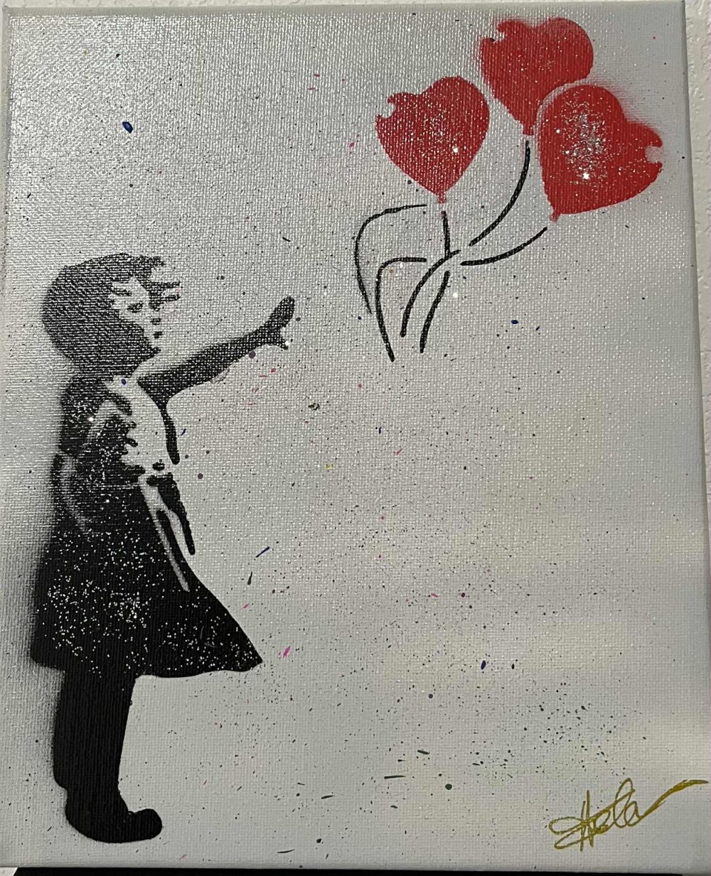 Tableau peinture mixte sur toile- AZELA - L'ENVOL DES COEURS 22x27 Street art poétique inspiré du style de la “Petite fille au ballon”
