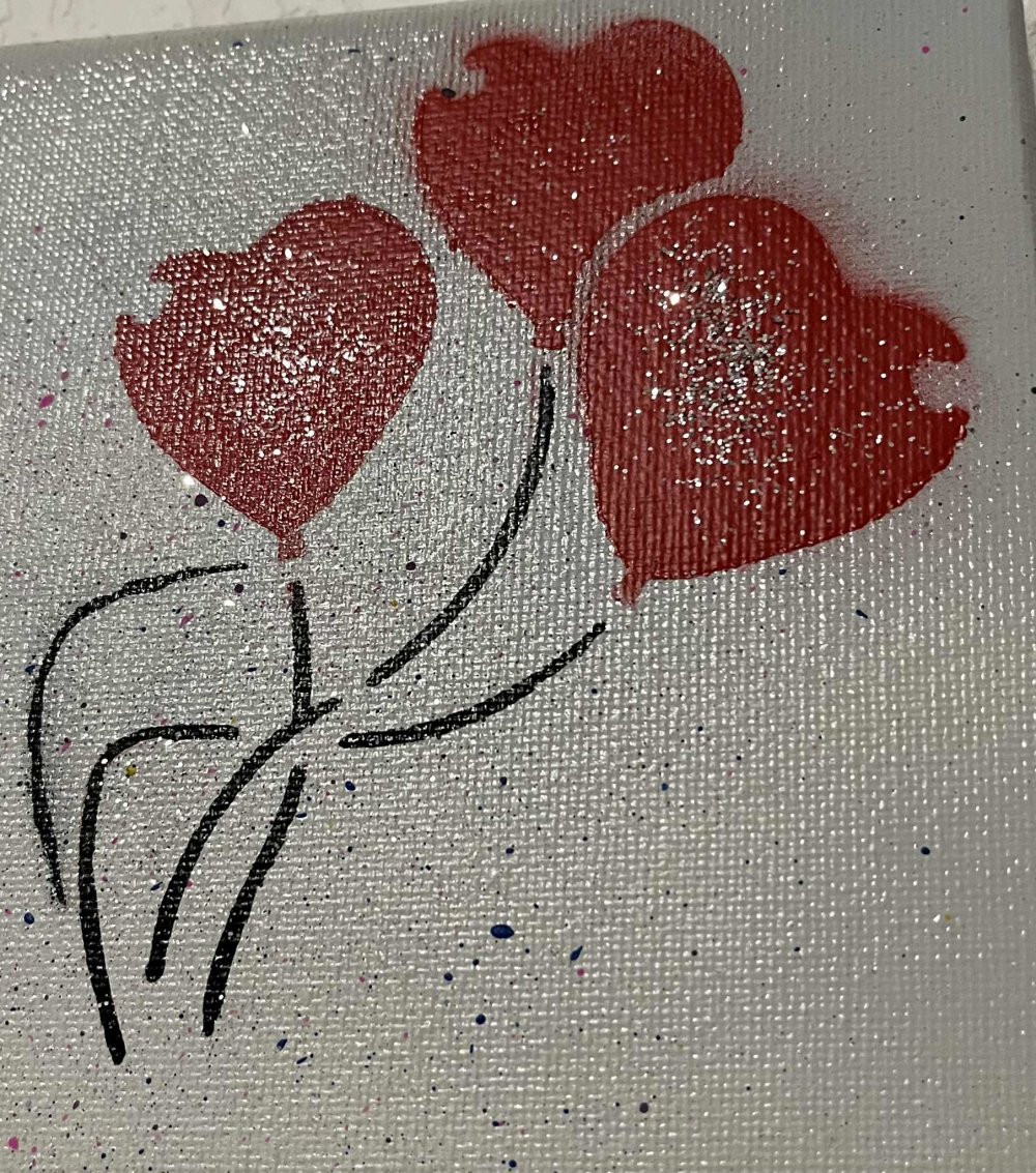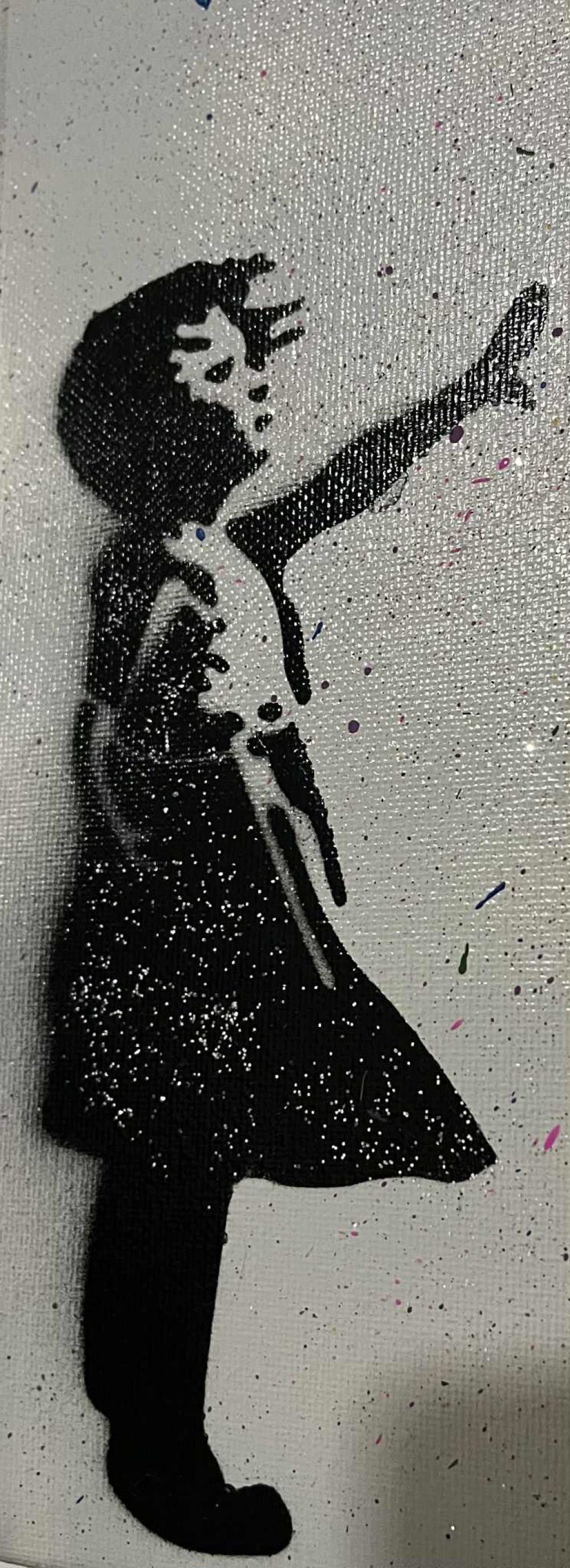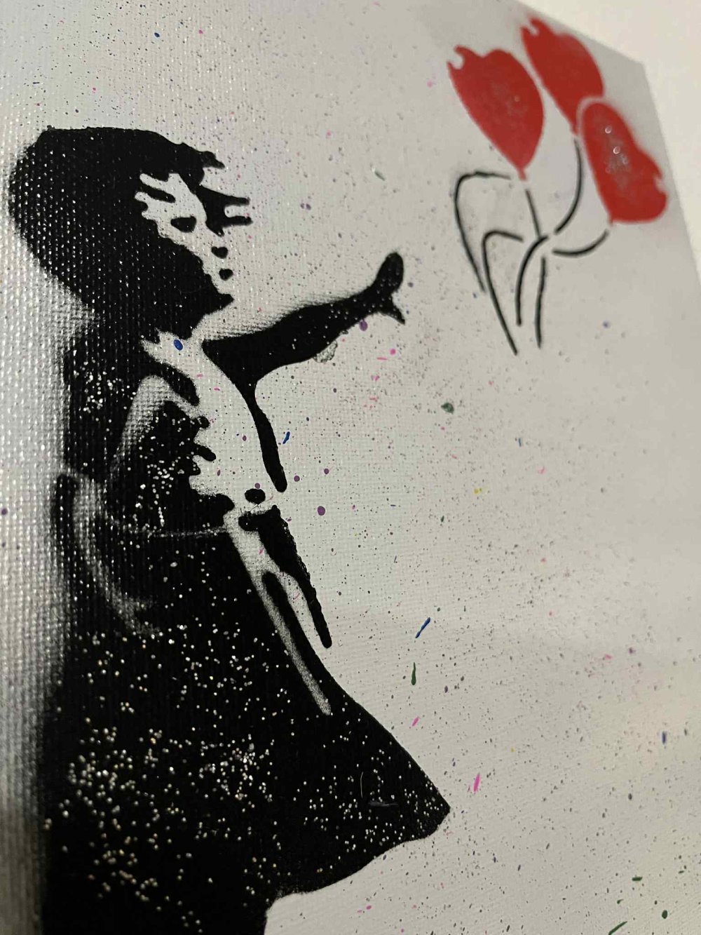 Trois ballons rouges en forme de cœur s’élèvent doucement dans un ciel gris moucheté de fines touches colorées. La silhouette noire, rehaussée de paillettes délicates, capte la lumière et ajoute une touche de rêve et de douceur. L’univers de cette œuvre rappelle le street art poétique popularisé par des artistes comme Banksy, tout en conservant la signature unique et lumineuse d’Azela.