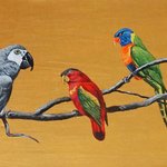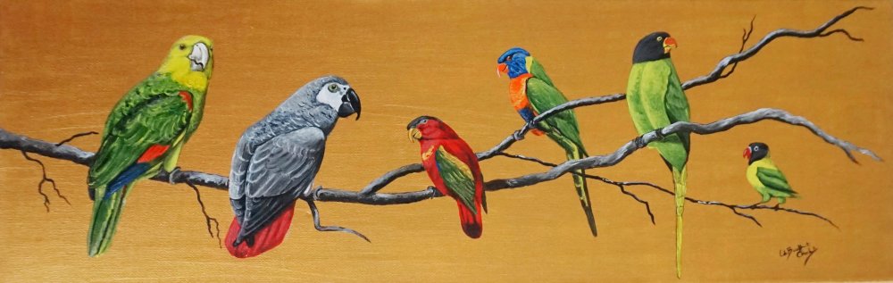 Six perroquets multicolores sur leur branche peintes sur toile