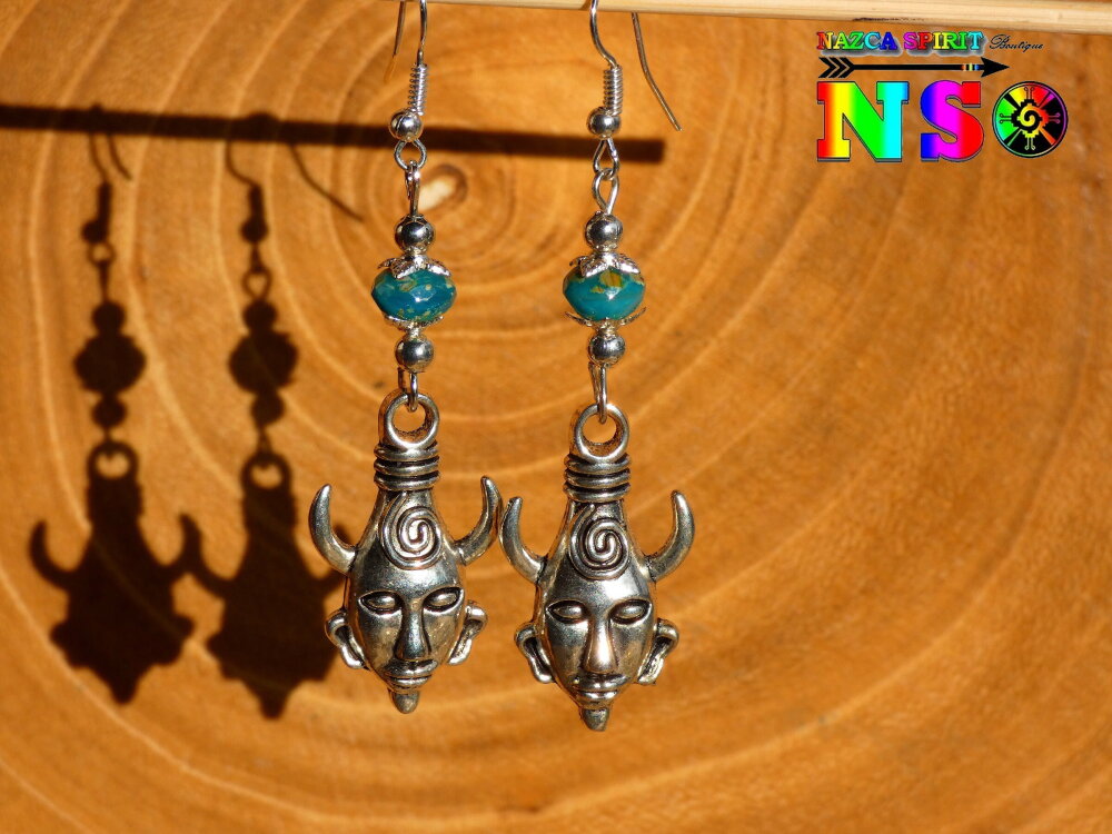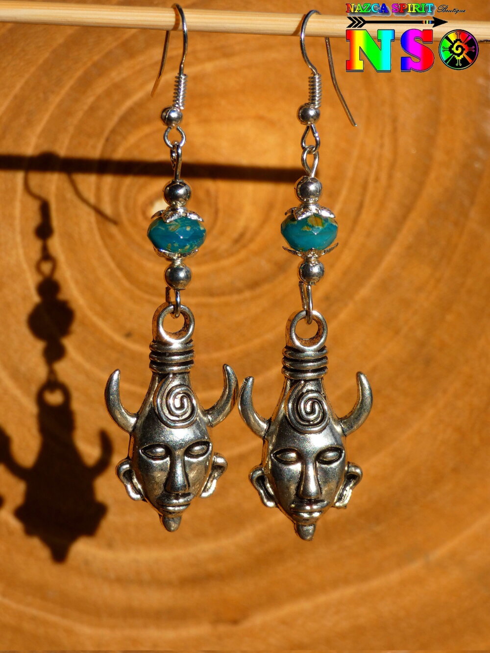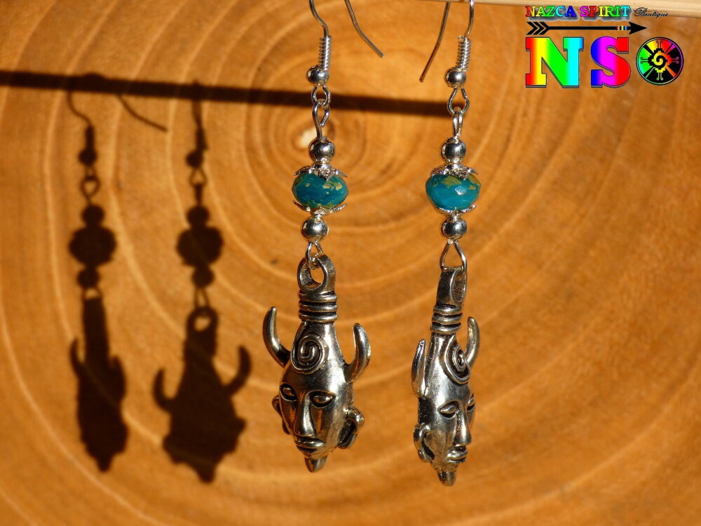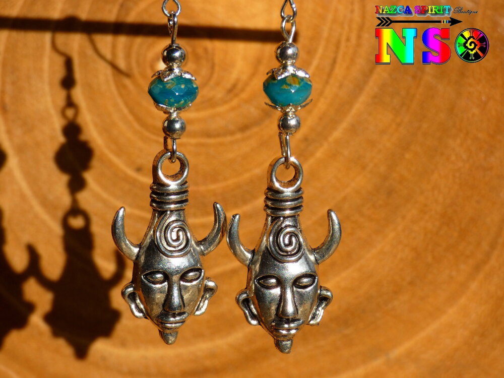 Pendants Africains Plaqué Argent et Cristal de Bohème - Bijou Ethnique Fait Main - Boucle d'Oreilles Masque Tribal - Création Artistique