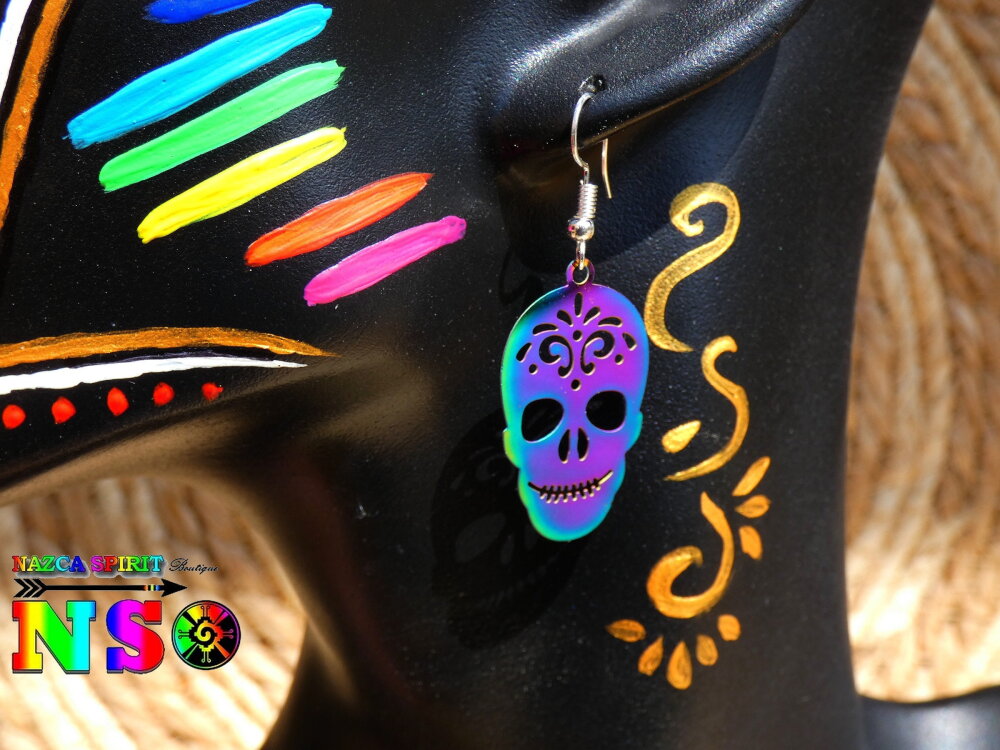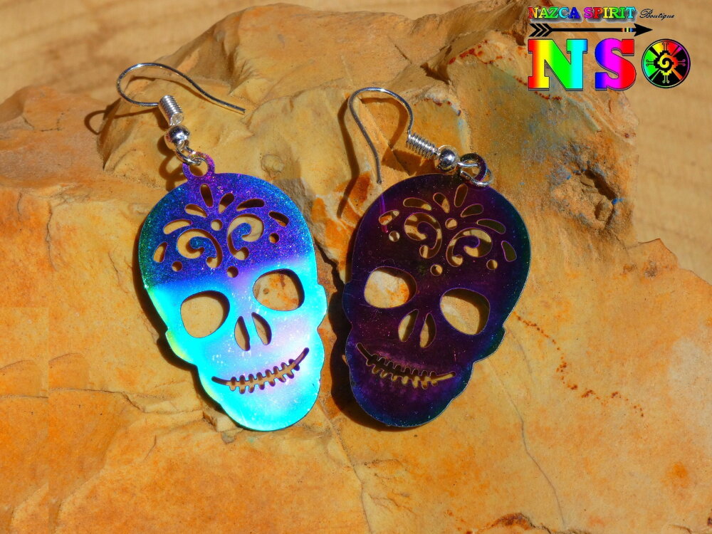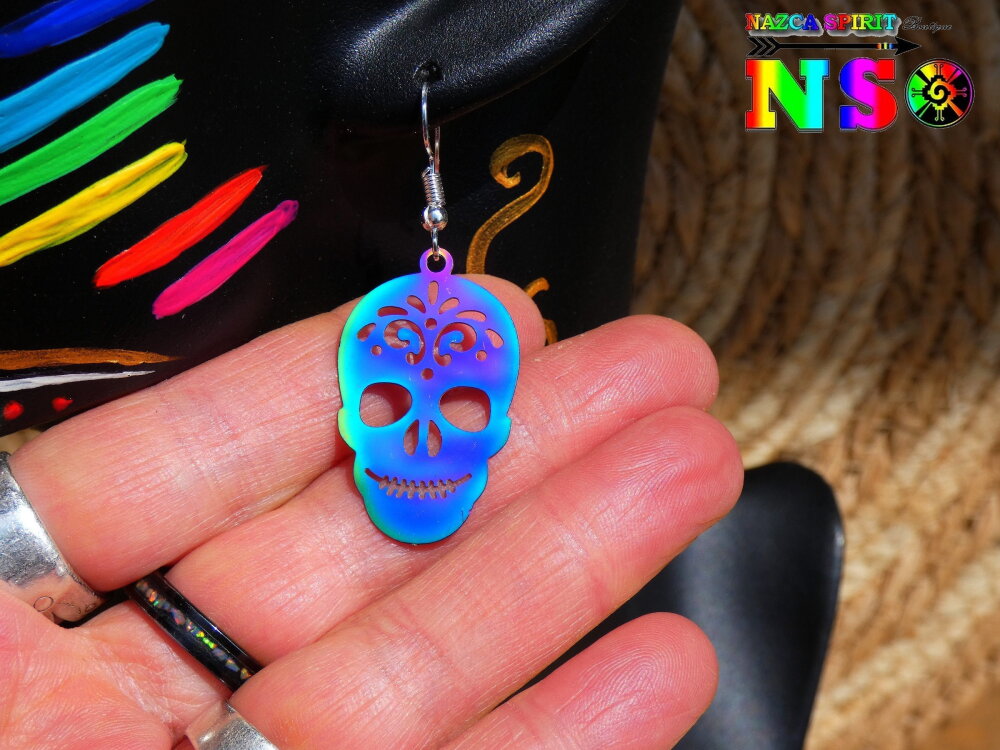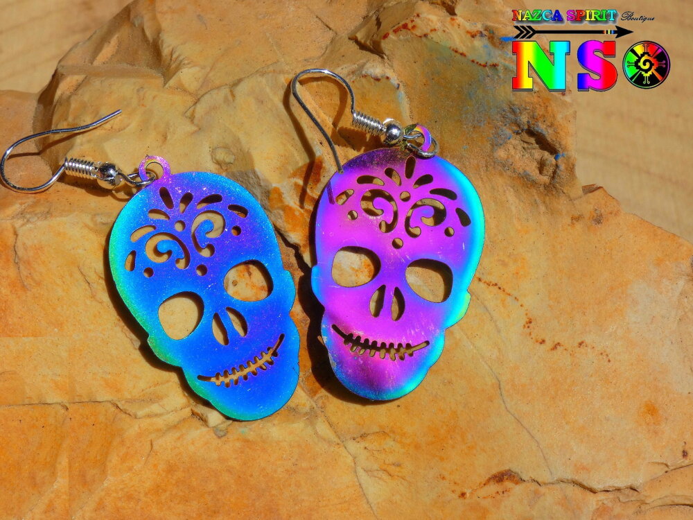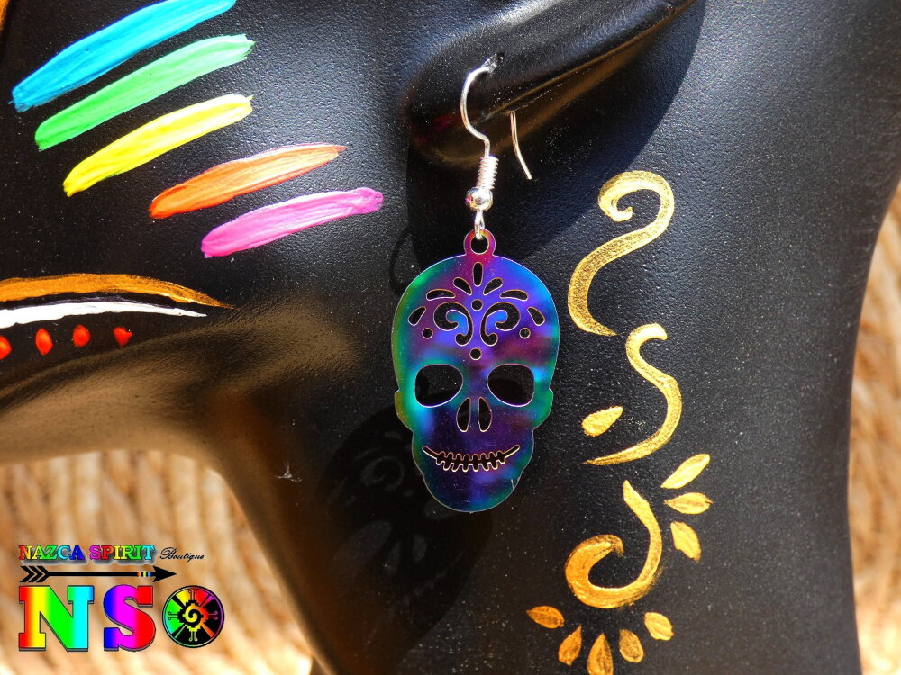 Superbes pendants d'oreilles crânes mexicains réalisés à partir de crochets plaqué argent et d''estampes crânes mexicains ciselés en acier inoxydable galvanisé couverture titane multicolore iridescent.