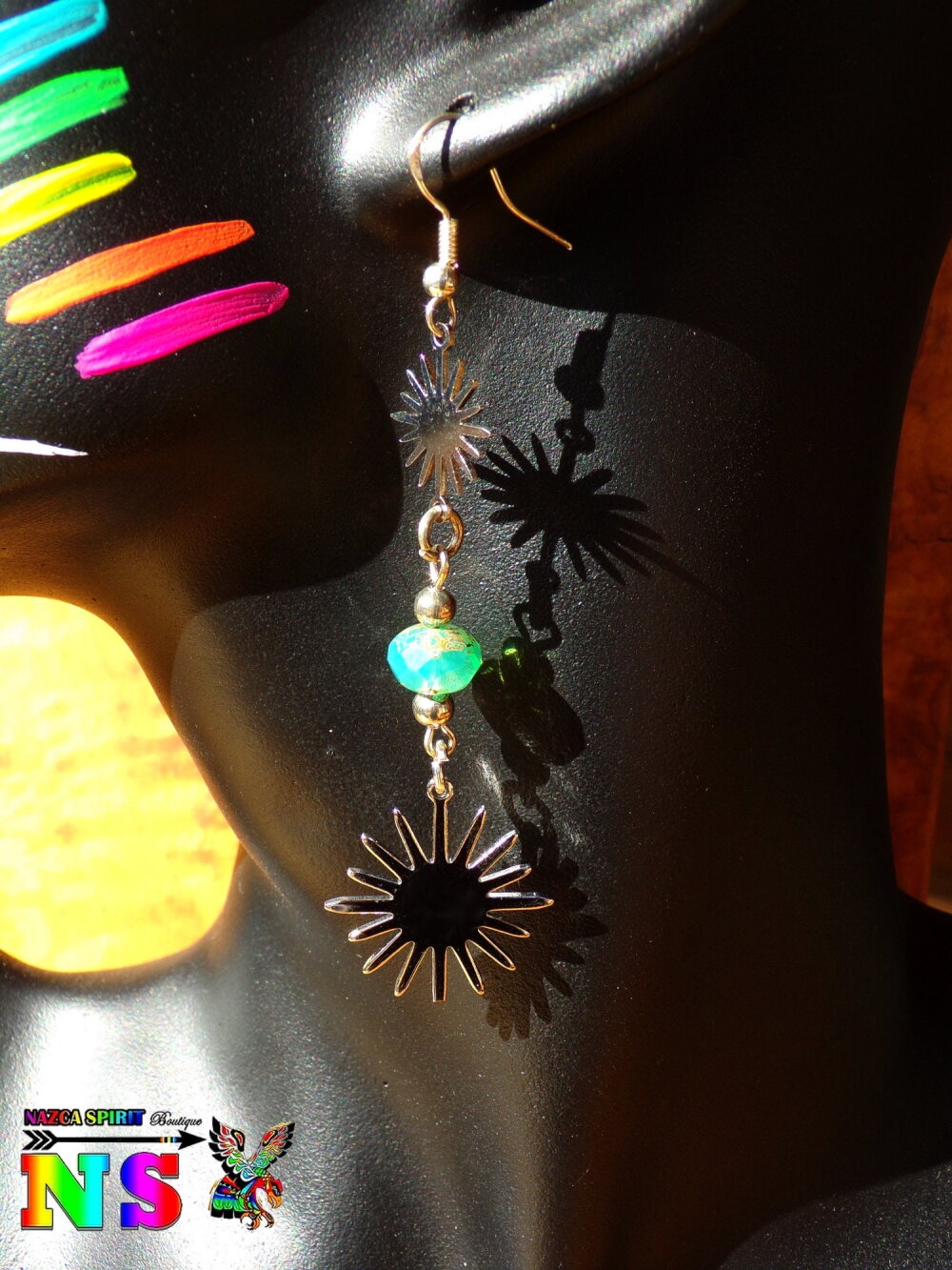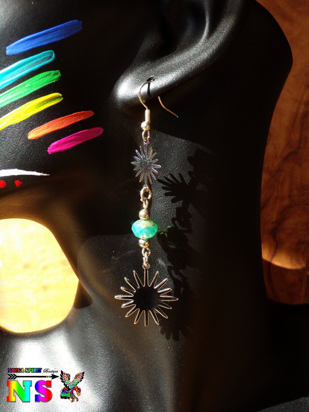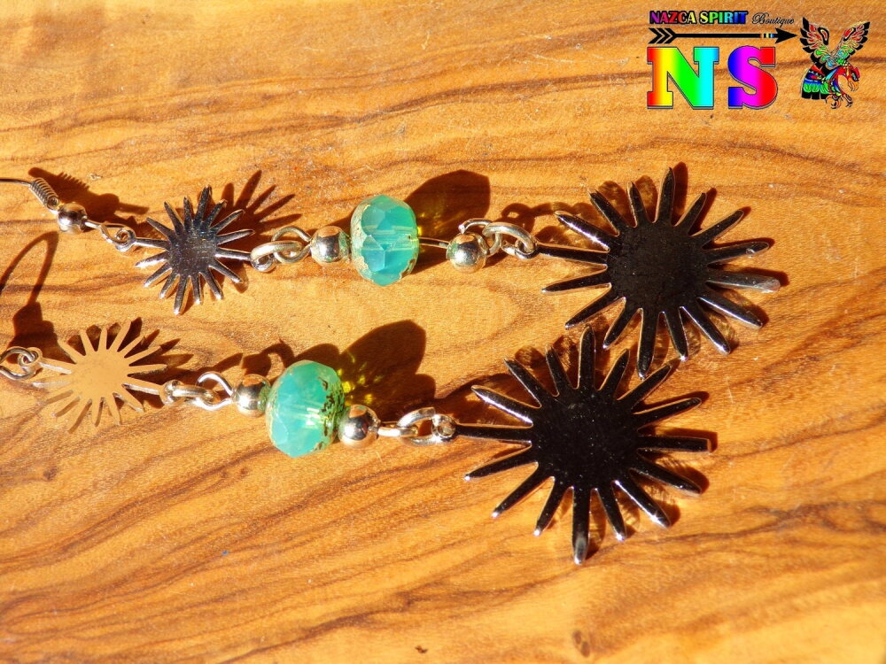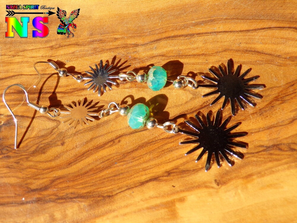 Pendants d'Oreilles Amérindiens de 8 cm ("3.14) de Long / Soleils en Acier Inoxydable Argent /Perles en Cristal Bohème Vert Opalescent
