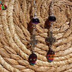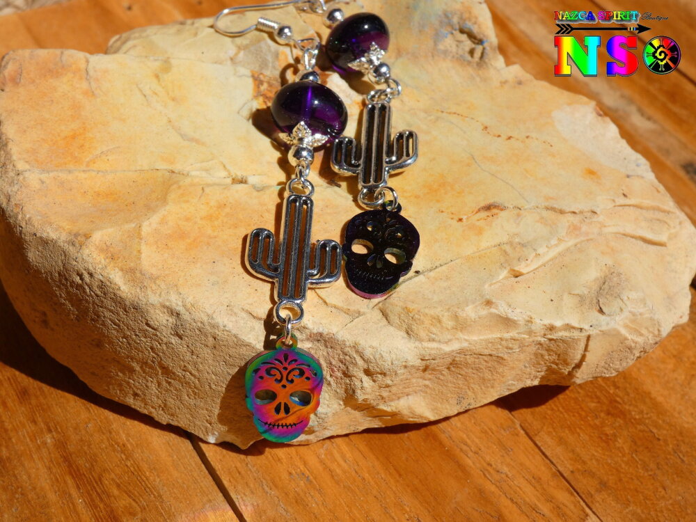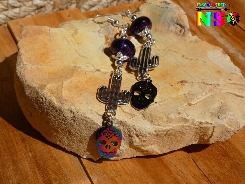 Pendants Esprit Mexique de 9 cm ("3.54) de Long - Boucles d'Oreilles Crânes Mexicains Multicolores Acier Inoxydable Cactus et Améthystes