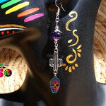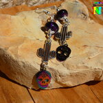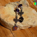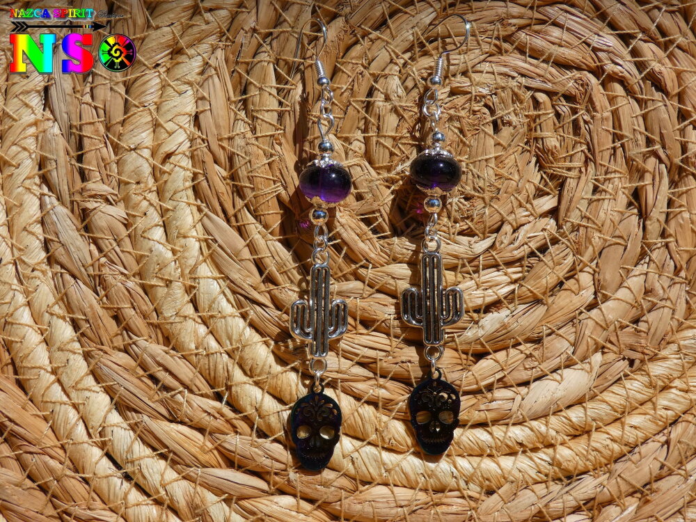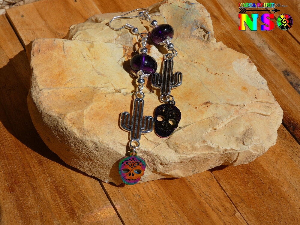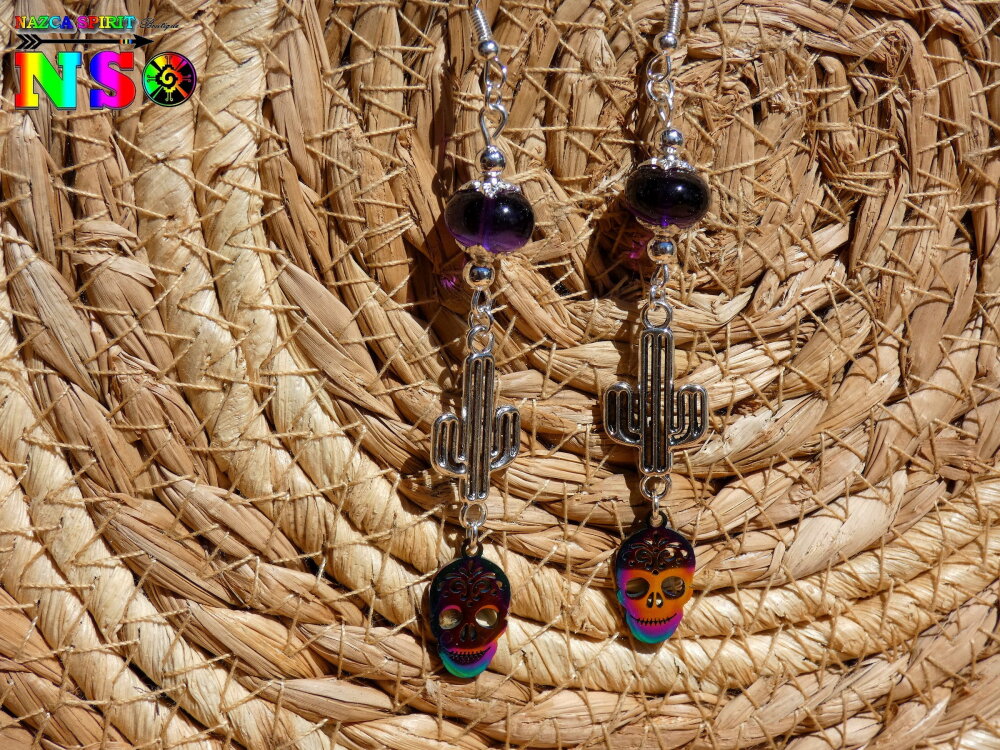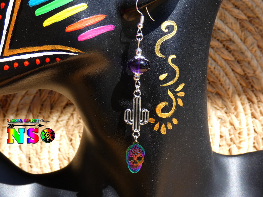 Pendants Esprit Mexique de 9 cm ("3.54) de Long - Boucles d'Oreilles Crânes Mexicains Multicolores en Acier Inoxydable, Cactus en Laiton Plaqué Argent et Améthystes Naturelles.