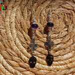 J'ai réalisé cette paire de pendants à partir de crochets d'oreilles en cuivre plaqué argent, de connecteurs cactus en laiton plaqué argent, de perles forme libre de 10 mm ("0.39) de diamètre en véritable améthystes naturelles (origine : Principauté d'Andorre) et de petits pendentif forme crâne mexicain ciselé couleur arc-en-ciel en acier inoxydable galvanisé (application d'une couche de titane par électrolyse).