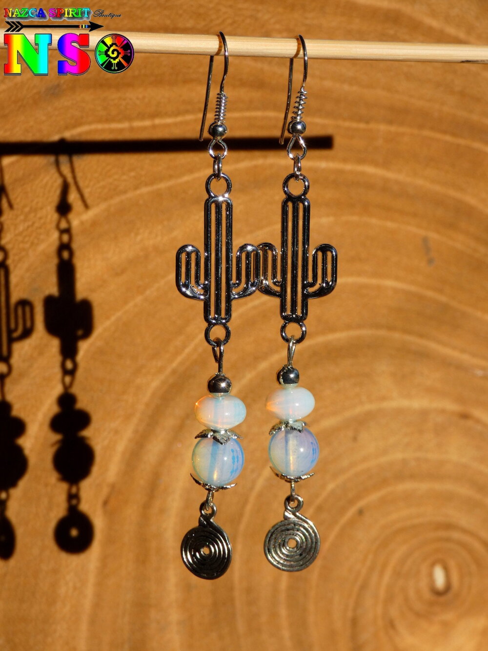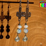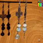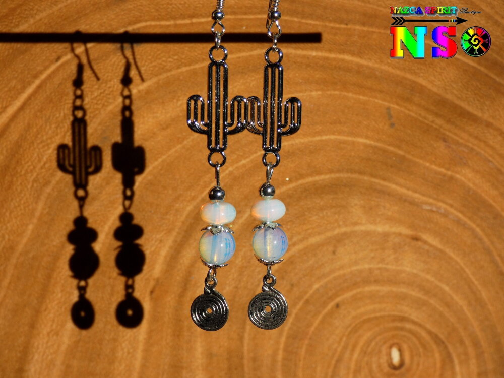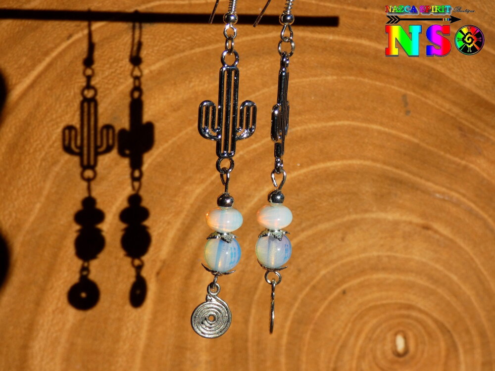 Pendants Ethniques Cactus et Perles en Opalines - Bijou Fait Main Cactus Plaqué Argent - Création Artistique Mexique - Argent et Opalescent