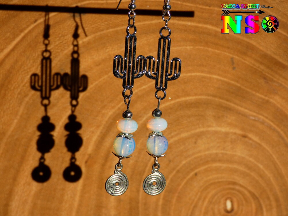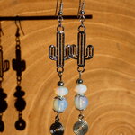 Ces pendants ont donc été réalisés à partir de connecteurs forme cactus en cuivre plaqué argent ciselés, de perles en opaline opalescentes et de crochets d'oreilles en cuivre plaqué argent ayant subi un traitement hypoallergénique.