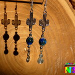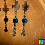Ces pendants ont donc été réalisés à partir de connecteurs forme cactus en cuivre plaqué argent ciselés, de perles en verre agrémentées de superbes couleurs océanes (déclinaison de bleu, de vert et or avec de jolis effets marins) et de crochets d'oreilles en cuivre plaqué argent ayant subi un traitement hypoallergénique.