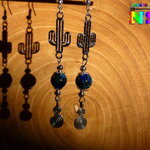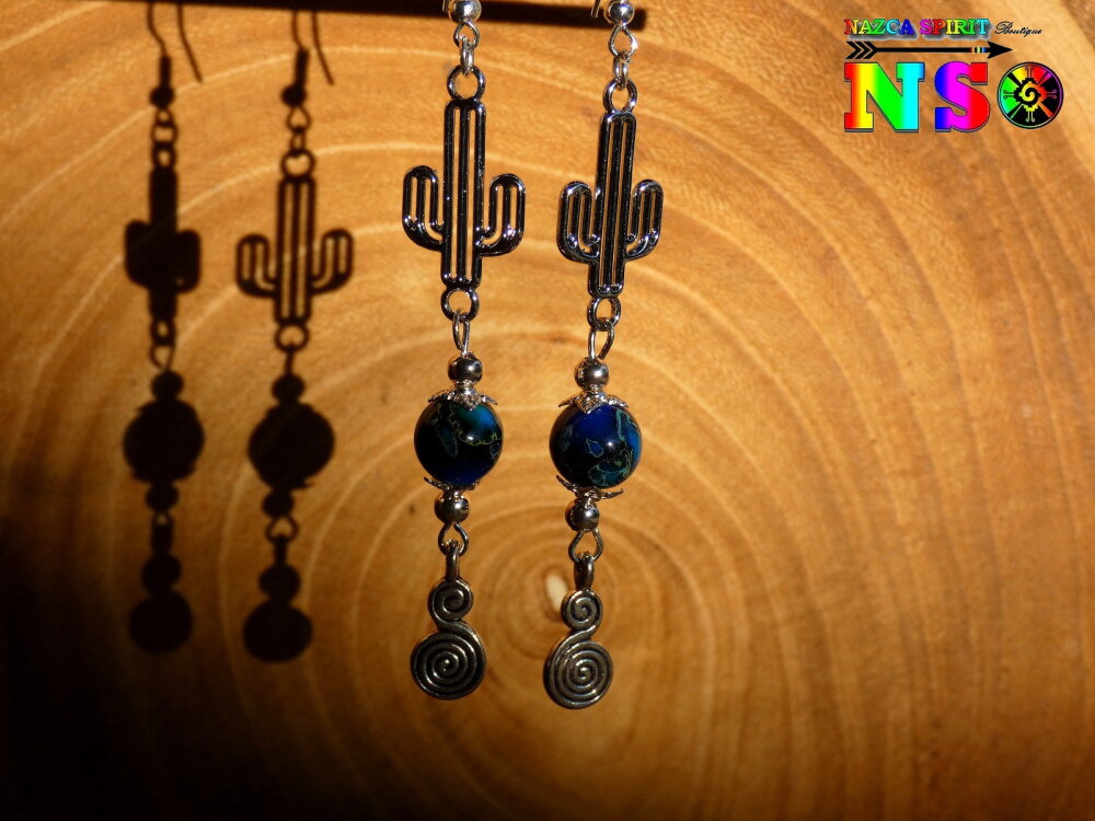 Pendants Ethniques Cactus et Perles en Verre Bleu Océan - Bijou Fait Main Cactus Plaqué Argent - Création Artistique Mexique - Perles Océane