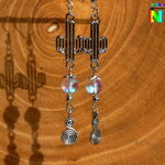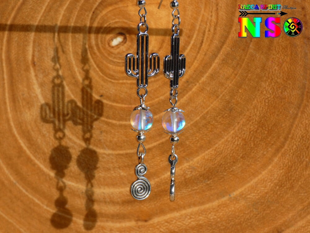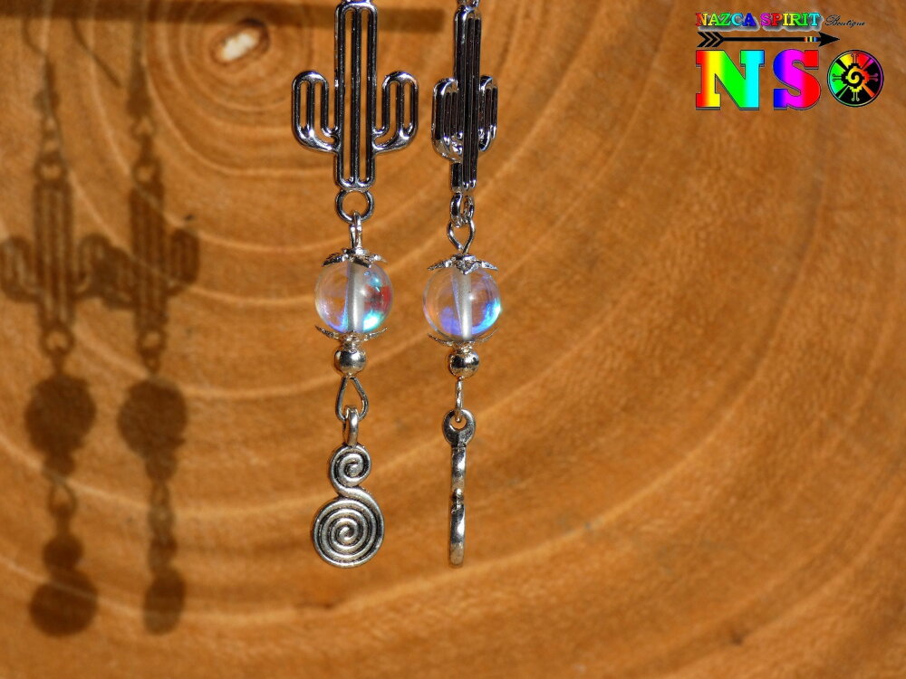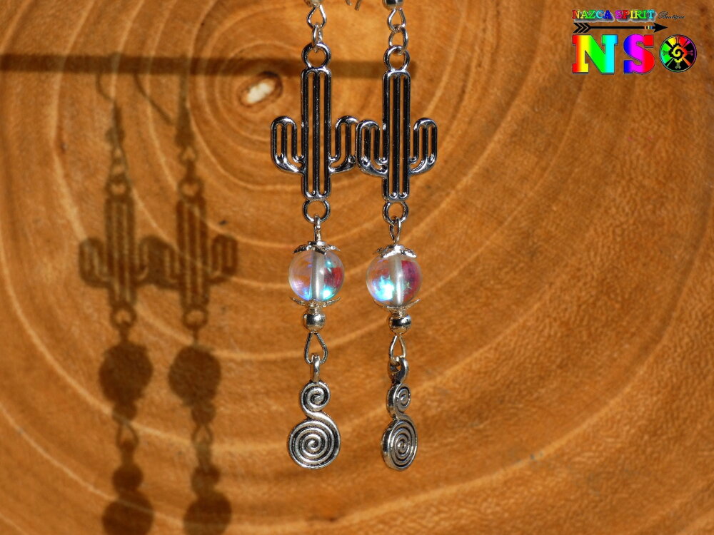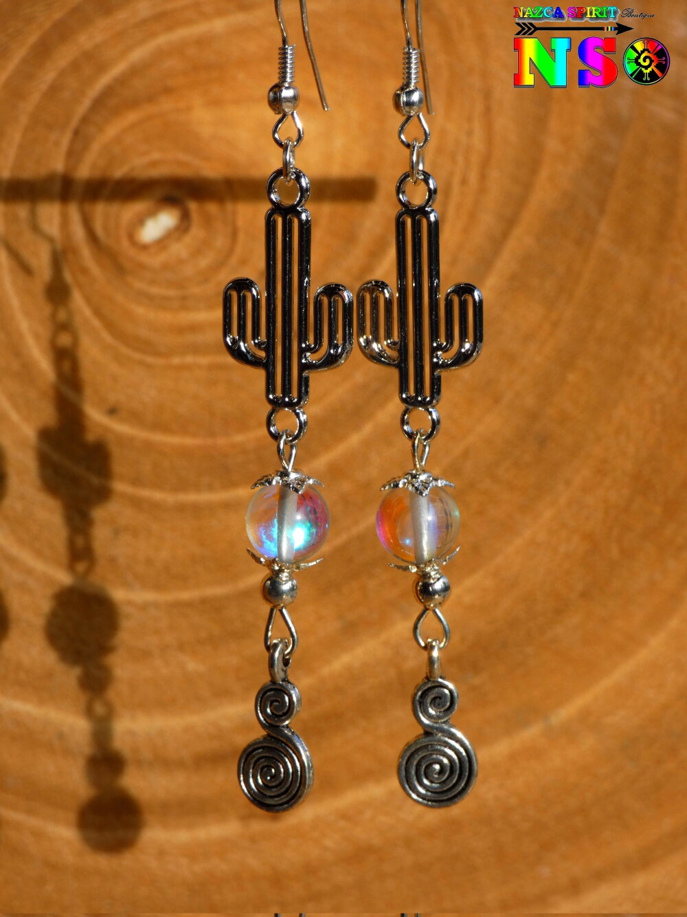 Pendants Ethniques Cactus et Pierres Fines Cristal de Roche Iridescent - Bijou Fait Main Cactus Plaqué Argent-Création Artistique Mexique
