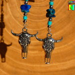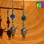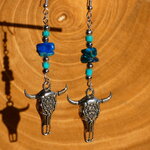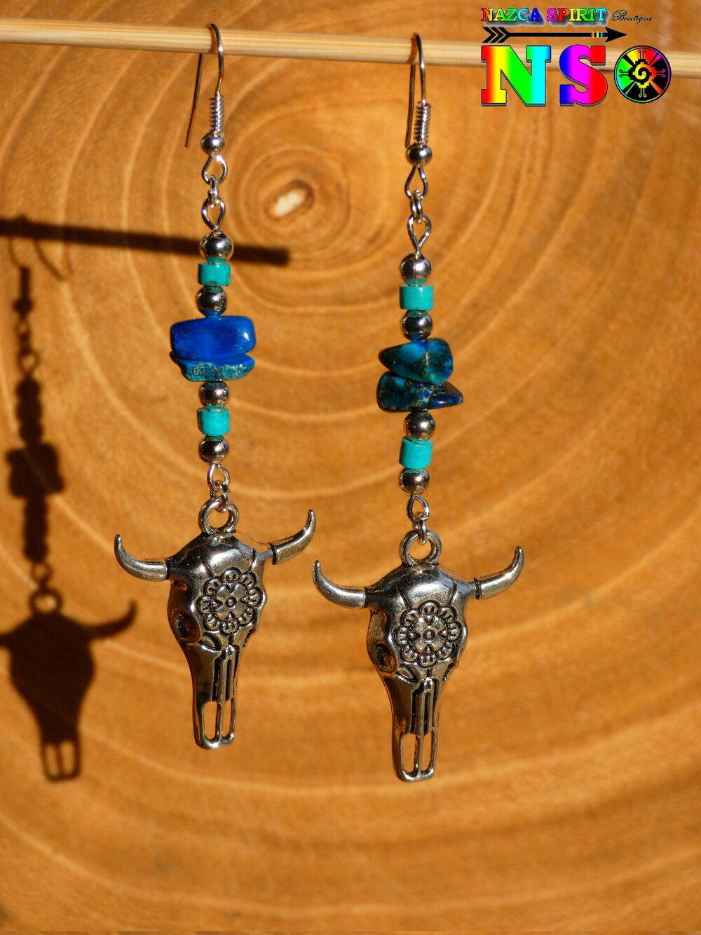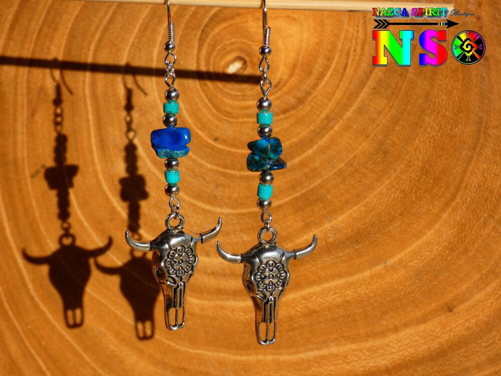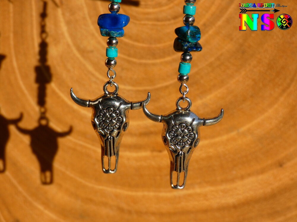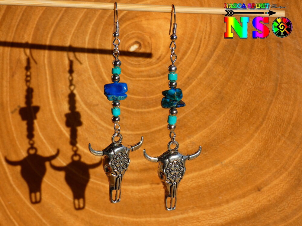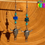 Les pendants ont été réalisés à partir de grandes breloques forme tête de bison en laiton plaqué argent gravées de jolis motifs fleurs, de perles en pierres fines de turquoises et de chips en jaspe impérial couleur bleu lapis et de crochets d'oreilles en cuivre plaqué argent ayant subi un traitement hypoallergénique.