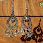 Ces pendants ont été réalisés à partir de connecteurs chandeliers et petits pendants spirales en alliage tibétain, de perles en cristal de bohème facettées bleu turquoise semi-transparent et de crochets d'oreilles en cuivre plaqué argent ayant subi un traitement hypoallergénique.