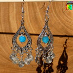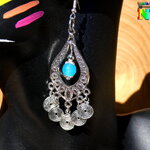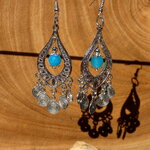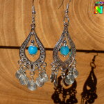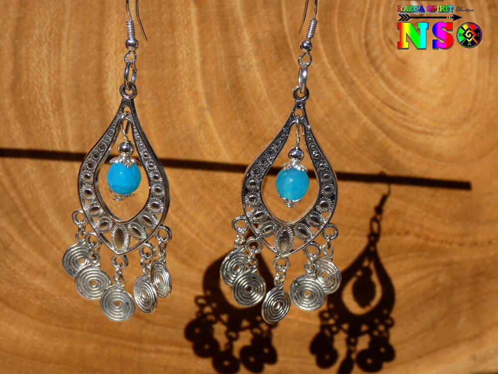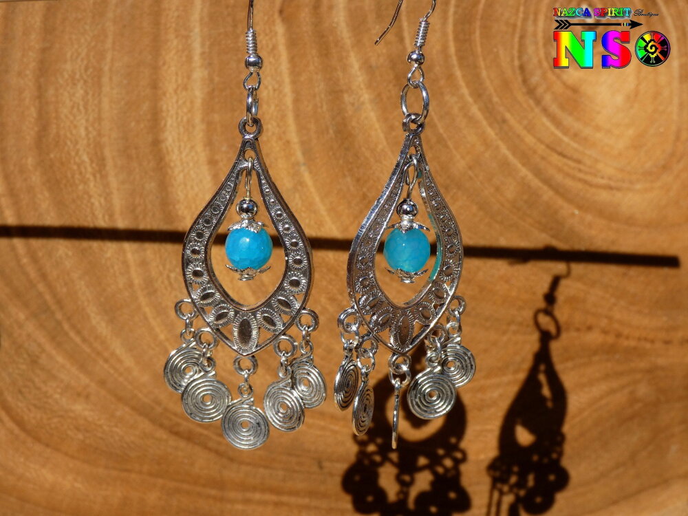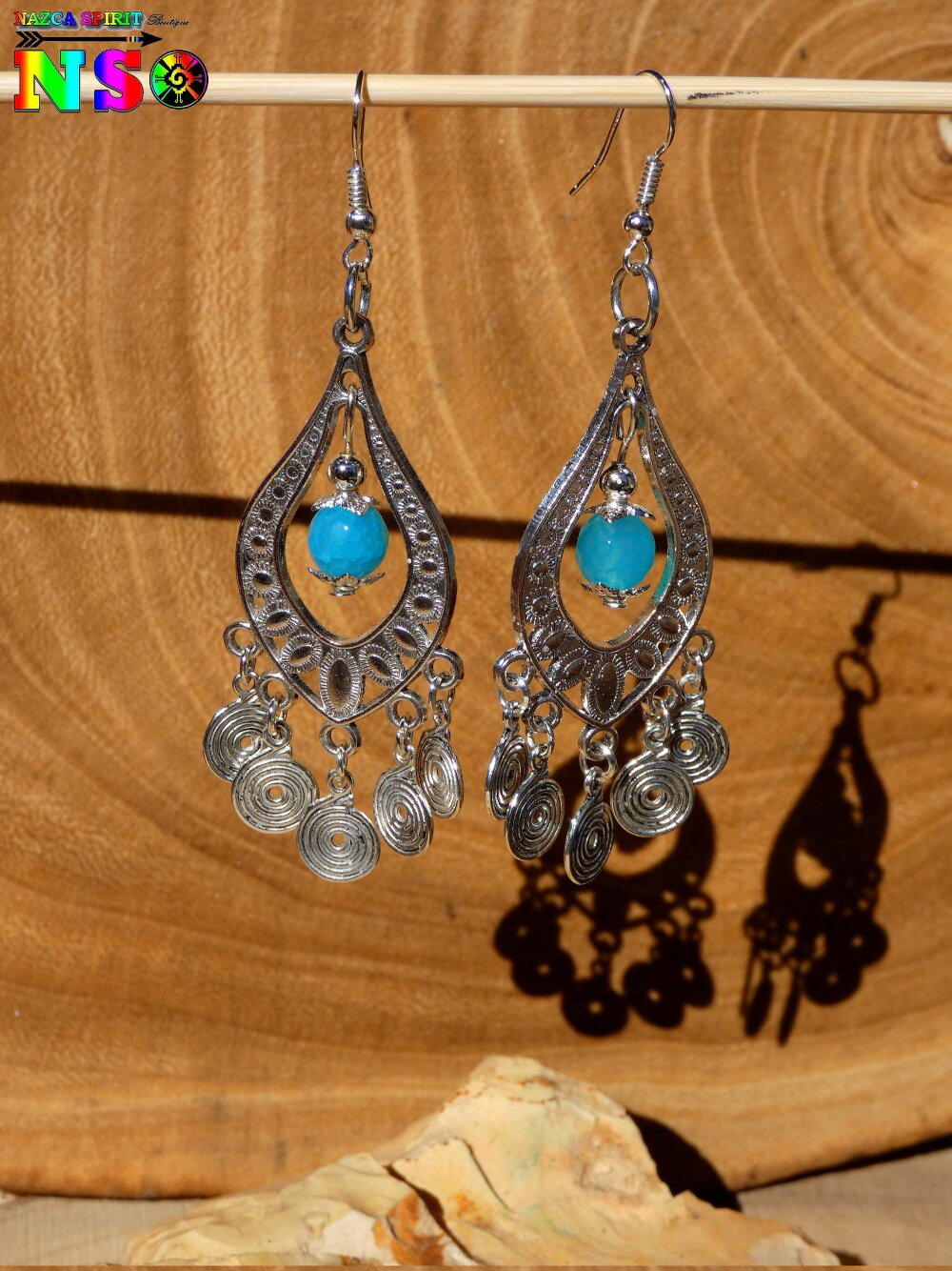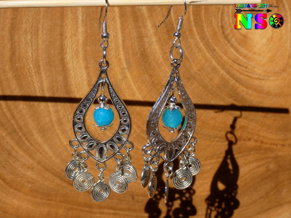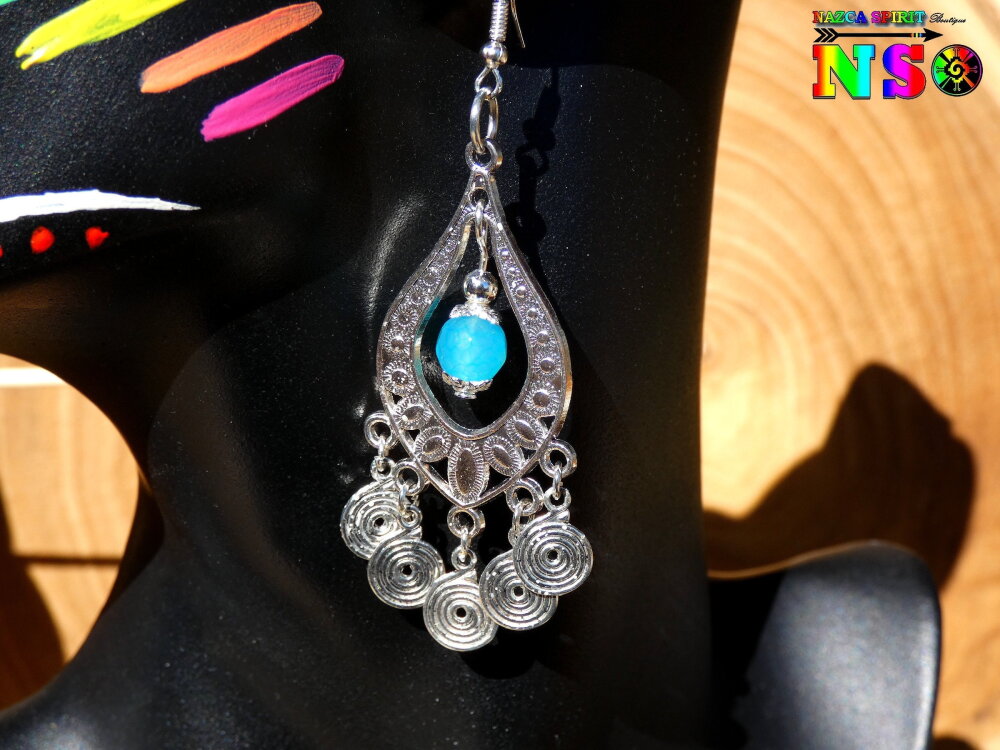 Pendants Ethniques Plaqué Argent et Perles Agate Veine de Dragon Bleu Turquoise -Bijou Bohème Ethnique Inspiration Pérou-Création Artistique