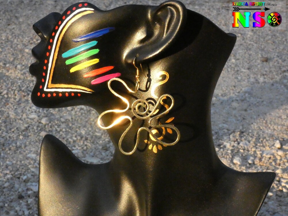 Je vous propose de découvrir une superbe paire de pendants d'oreilles pour oreilles percées inspiré des bijoux inca et maya que j'ai intégralement réalisés à partir de fil de laiton doré provenant de mon fournisseur basé sur Paris.