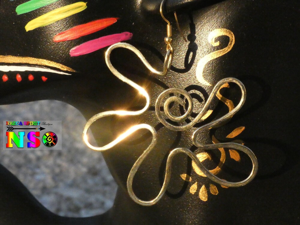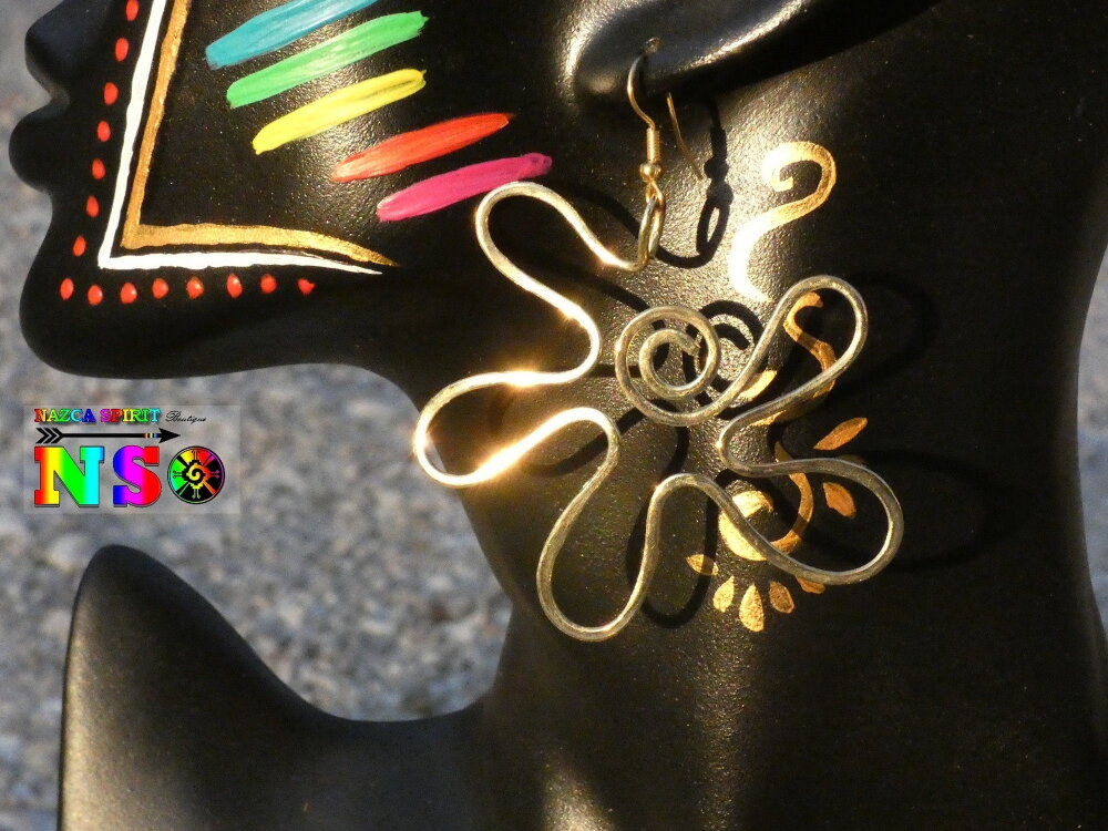 Pendants Grandes Fleurs Inca Maya en Laiton Or Français - Boucles d'Oreilles Bohèmes pour Femme -Bijou Artisanal Lumineux Esprit Or Précieux