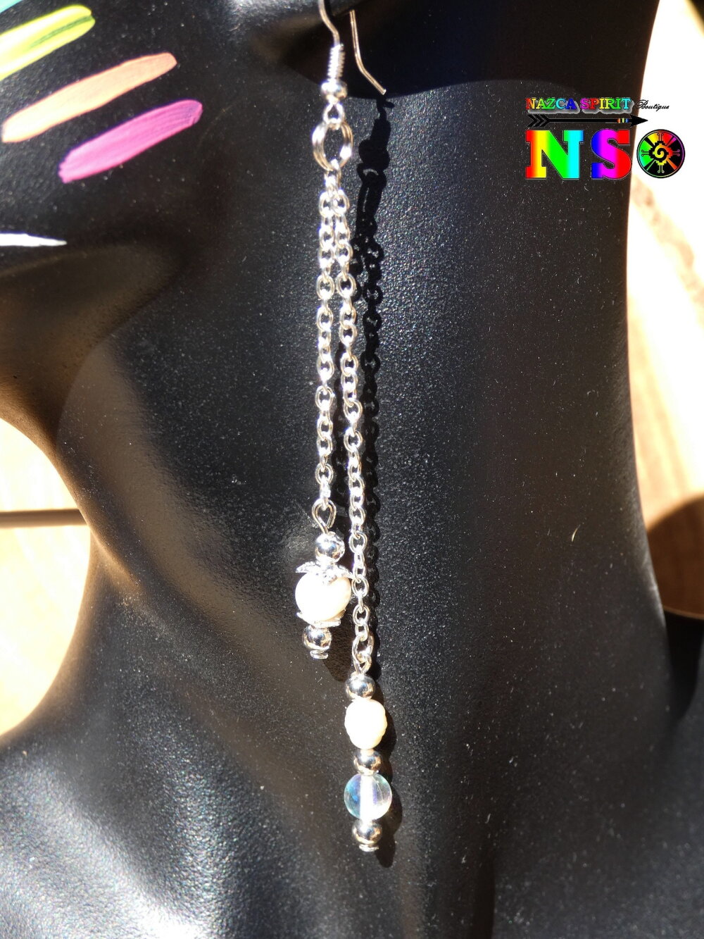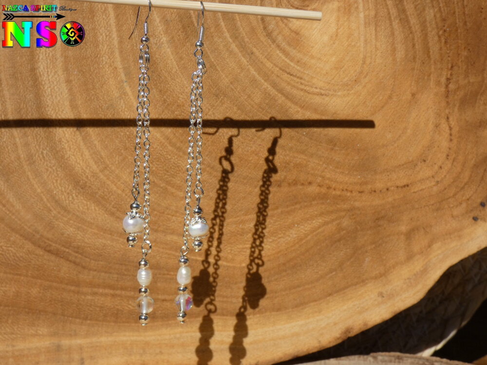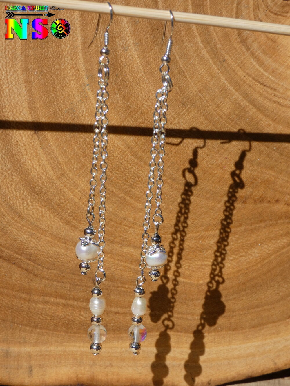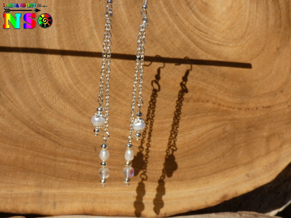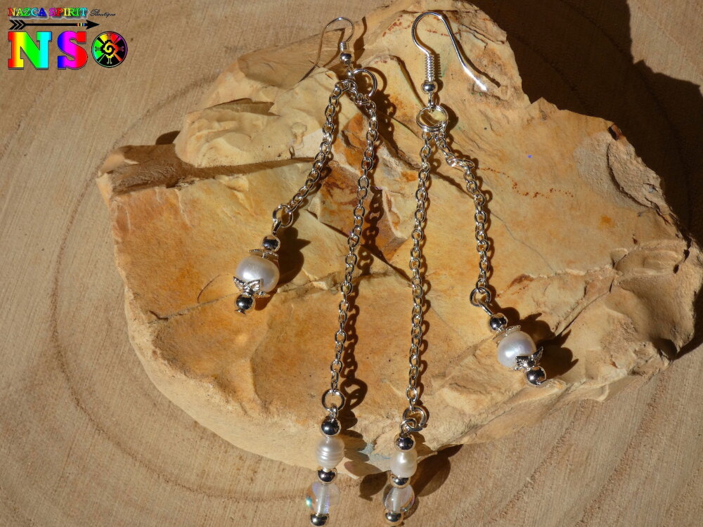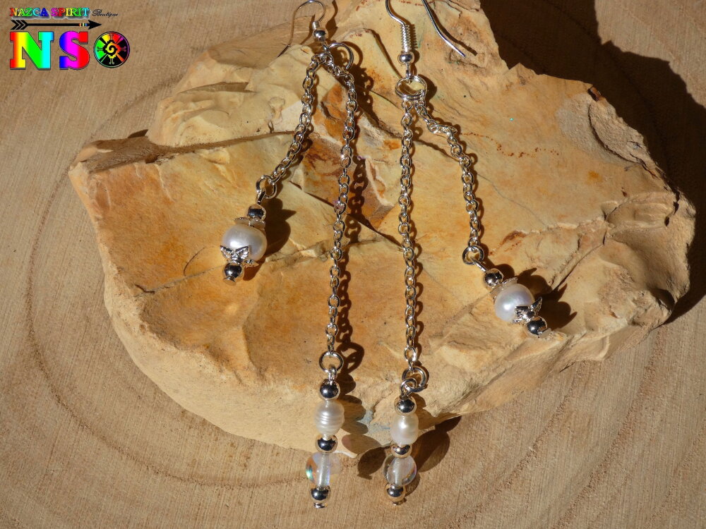 Je vous propose de découvrir une sublime paire de pendants de 10.5 cm ("4.13) de long esprit bijoux tahitiens réalisée à partir de 2 chaînes fines en argent 925, de perles de culture blanches originaire des Philippines, de perles imitation pierre de lune en cristal Tchèque Aurore Boréale, et de crochets d'oreilles en cuivre plaqué argent ayant subi un traitement hypoallergénique.