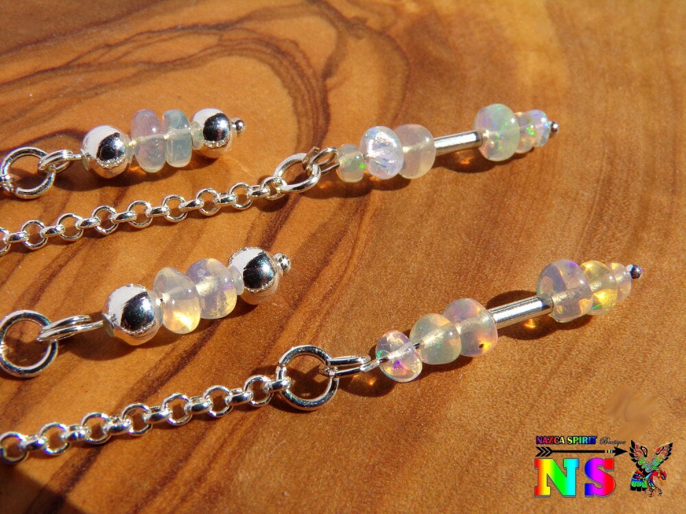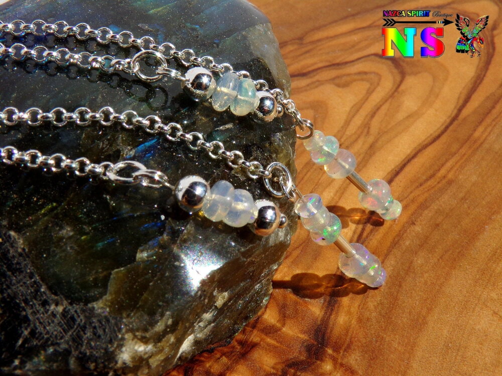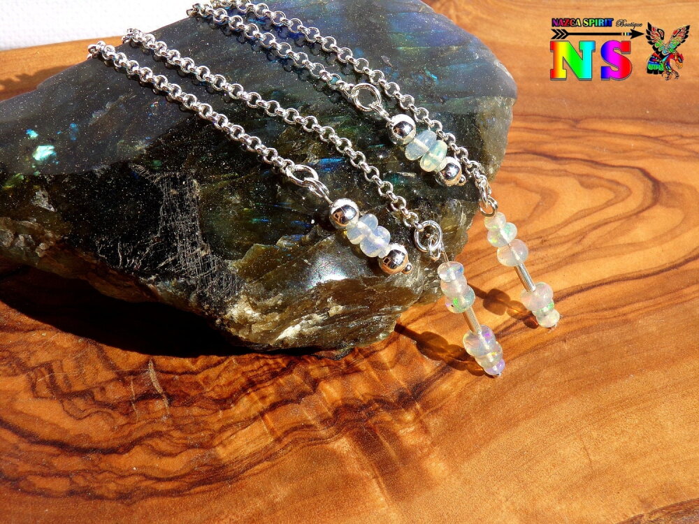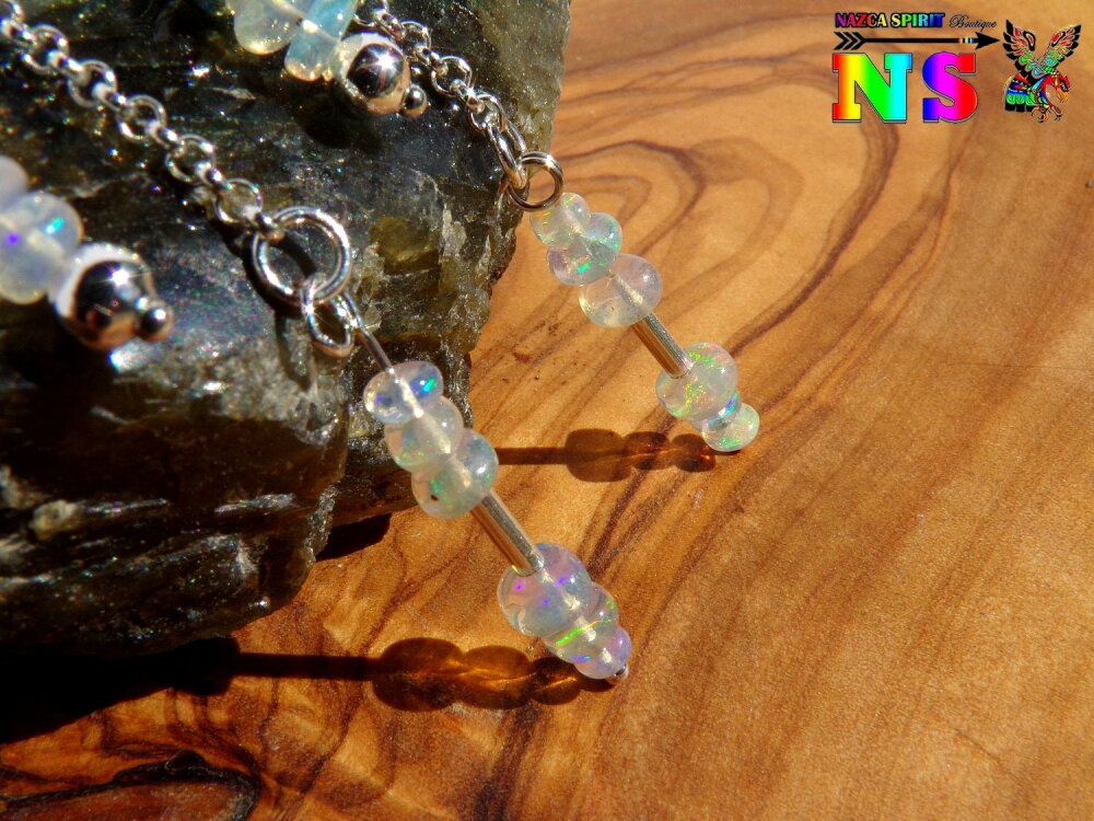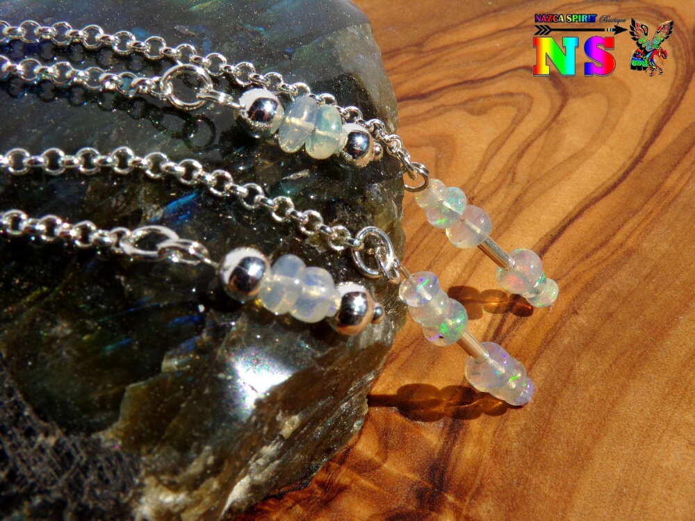 Pendants Oreilles Percées, Chaîne Argent 925, Perles en Opales Welo Ethiopie, Bijou Sensuel pour Femme, Création Artisanale Nazca Spirit