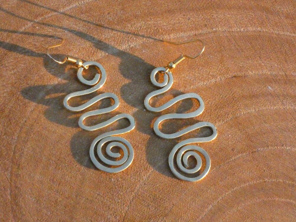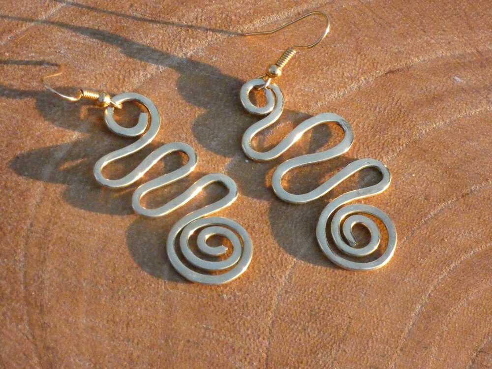 Les pendants ont été réalisés à partir d'un fil de laiton de 1.5 mm de diamètre que j'ai façonné à la main, façonné en forme de spirales, puis que j'ai martelé, poncé et poli pour obtenir une jolie finition or miroir afin d'apporter une belle touche précieuse semblable à de l'or pour un prix bien moins couteux.