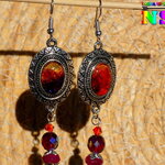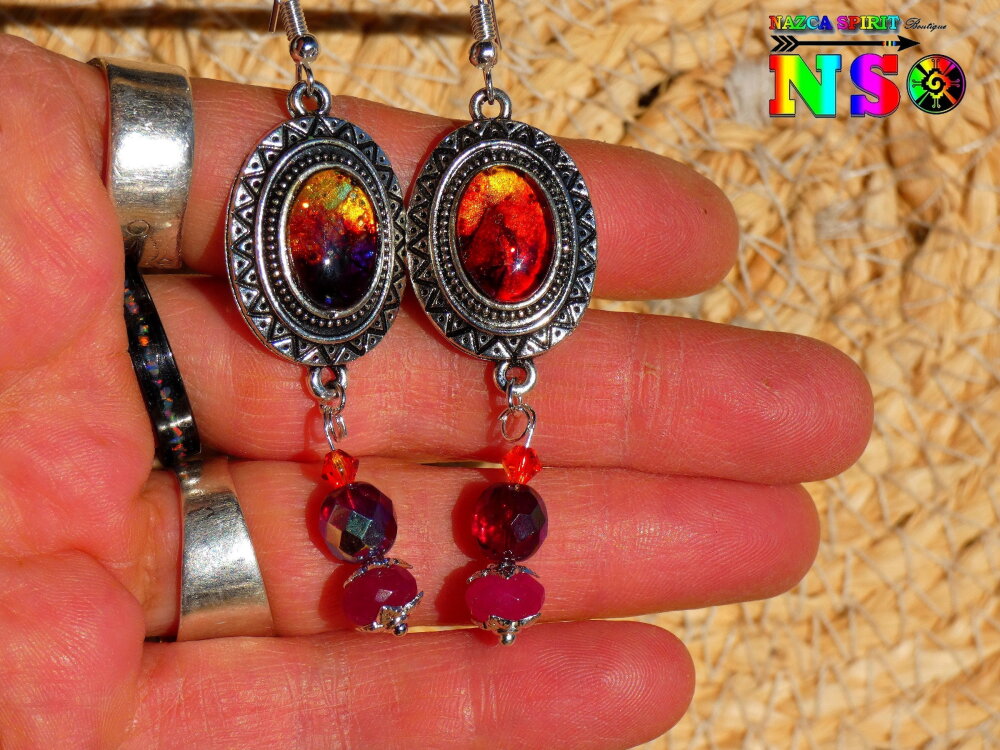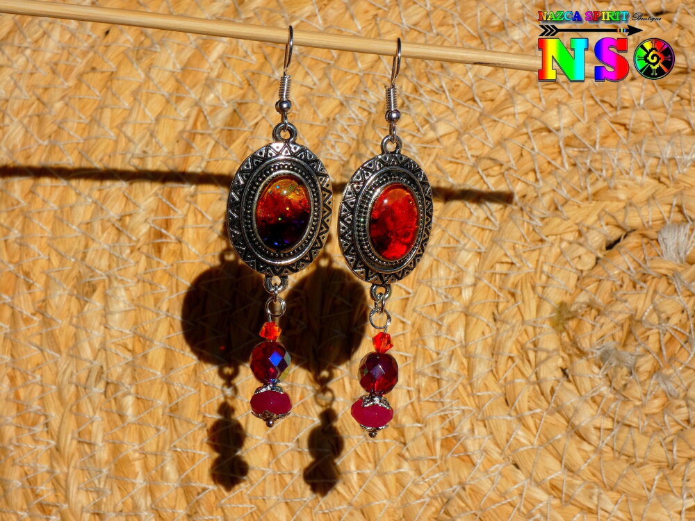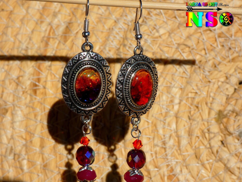 Pendants tribal ethnique Ovales Gravés Style Bijoux Mayas - Boucles d'oreilles Artisanales Rubis et Cabochons Faits Main Multicolore Iridescent.