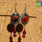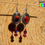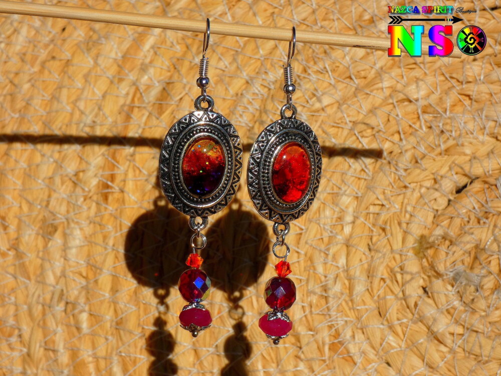 Je vous propose de découvrir une superbe paire de pendants d'oreilles pour oreilles percées de style Mayas. Pour réaliser cette paire de pendants je me suis inspirée des bijoux mayas. Les pendants ont été réalisés à partir de connecteurs ovales gravés de motifs géométriques mayas sur lesquels j'ai serti des cabochons ovales en verre que j'ai coloré à la main à l'aide d'une technique que j'ai inventée puis développée au fil des ans. J'ai, ensuite, relié au bout des connecteurs, des petits pendants réalisés à partir de perles toupies en cristal autrichien Opale Fire, de perles ovales facettées en cristal de bohème rouge grenat avec de jolis reflets iridescents et de perles abaques en véritable rubis facetté rouge rosé semi transparent (origine : Inde).