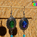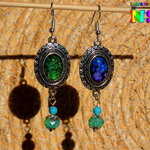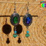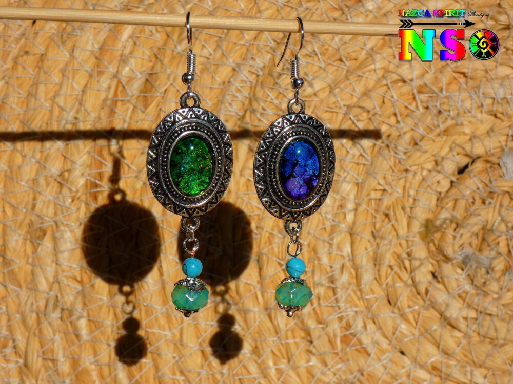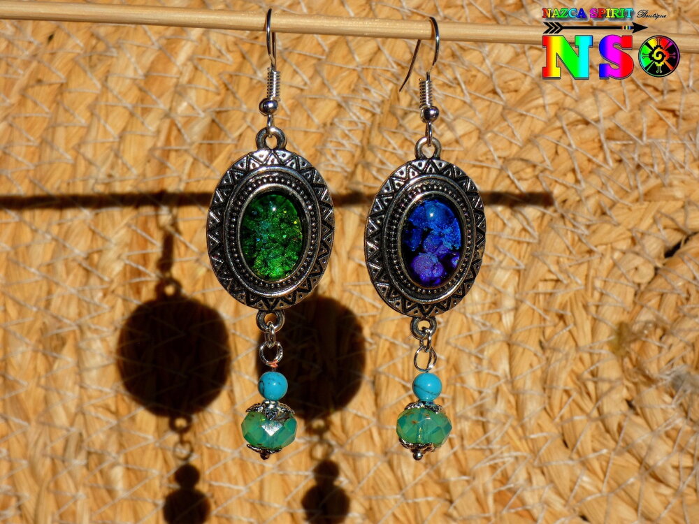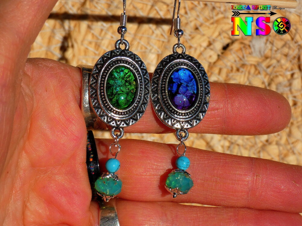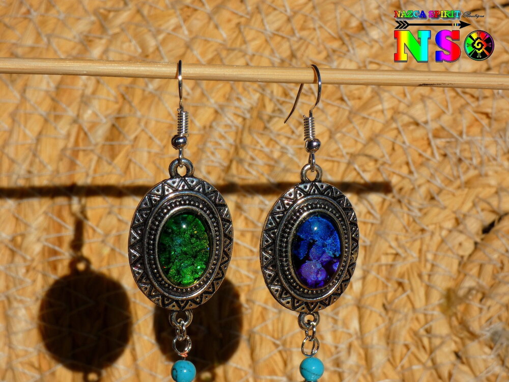 Pendants Tribal Ethnique Ovales Gravés Style Mayas-Boucles oreilles Artisanales Turquoises et Cabochons Faits Main Bleu Vert Iridescent