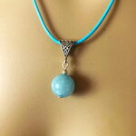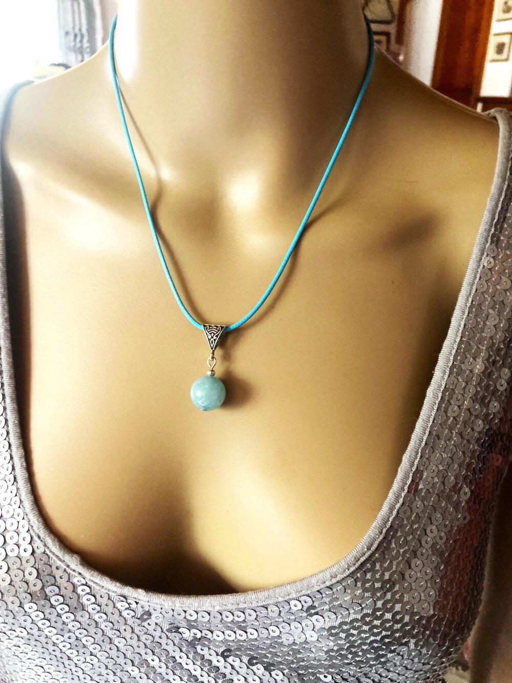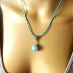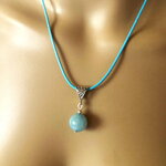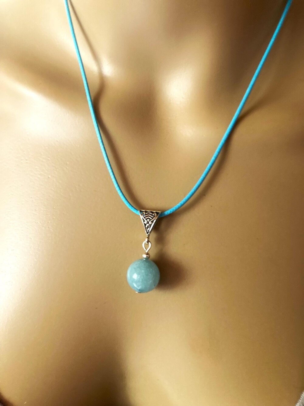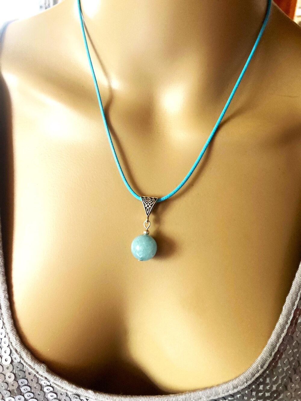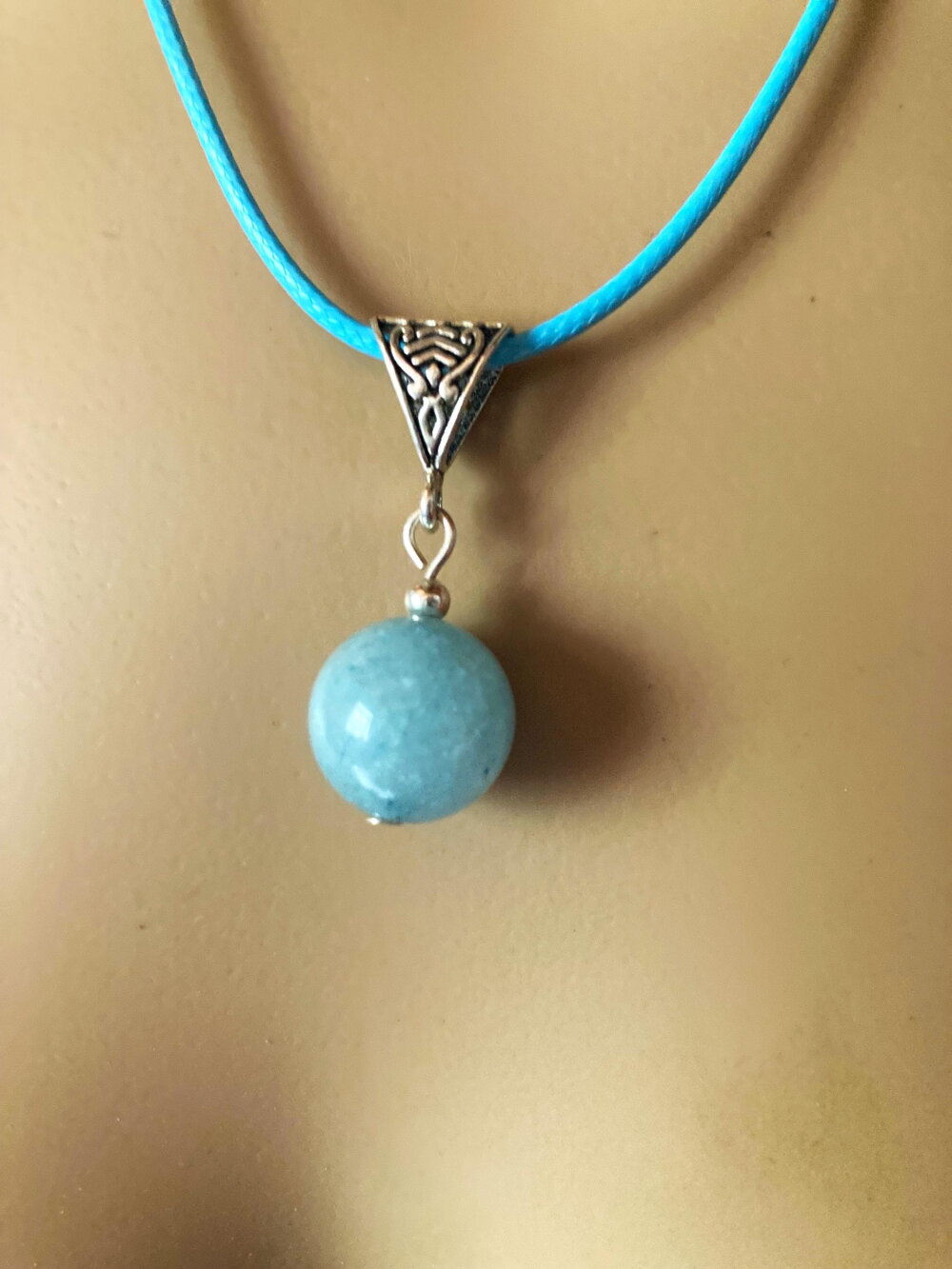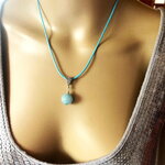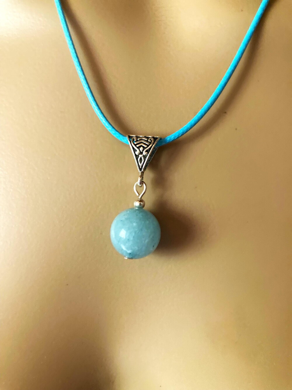 Pendentif pierre aigue marine sur collier cordon bleu clair ou noir. Bijou femme.