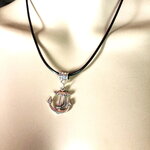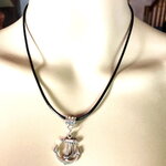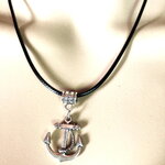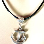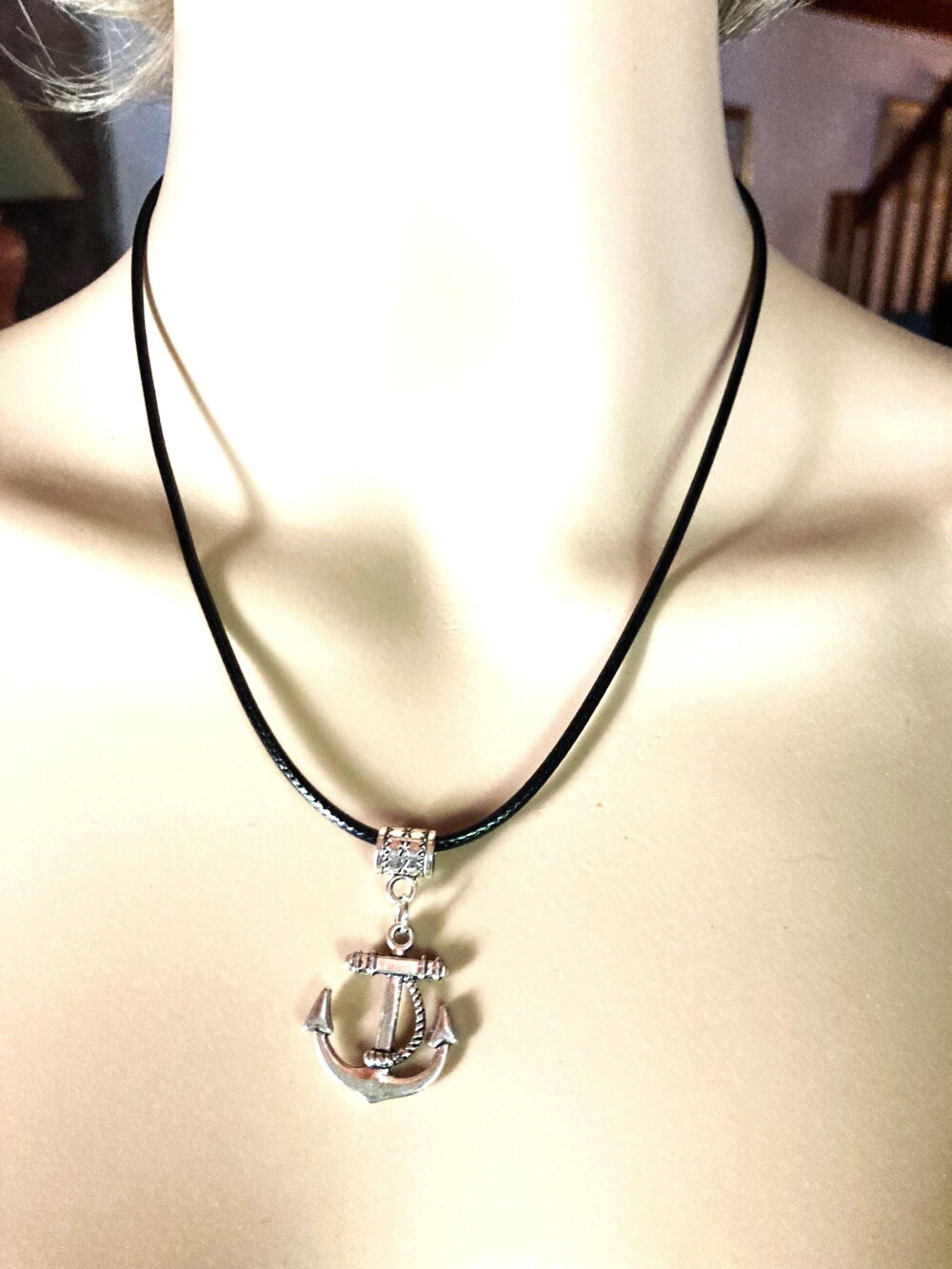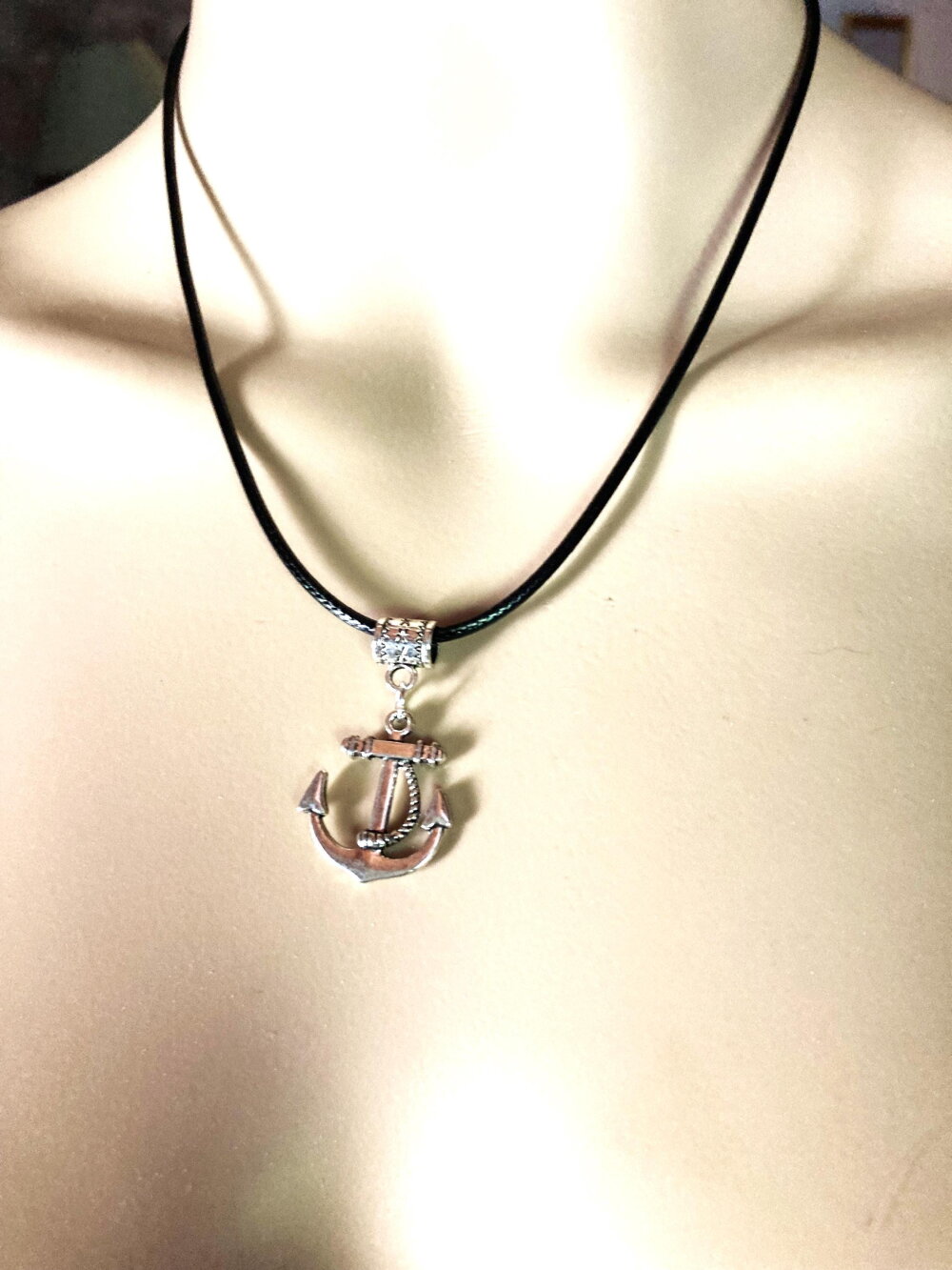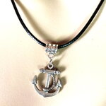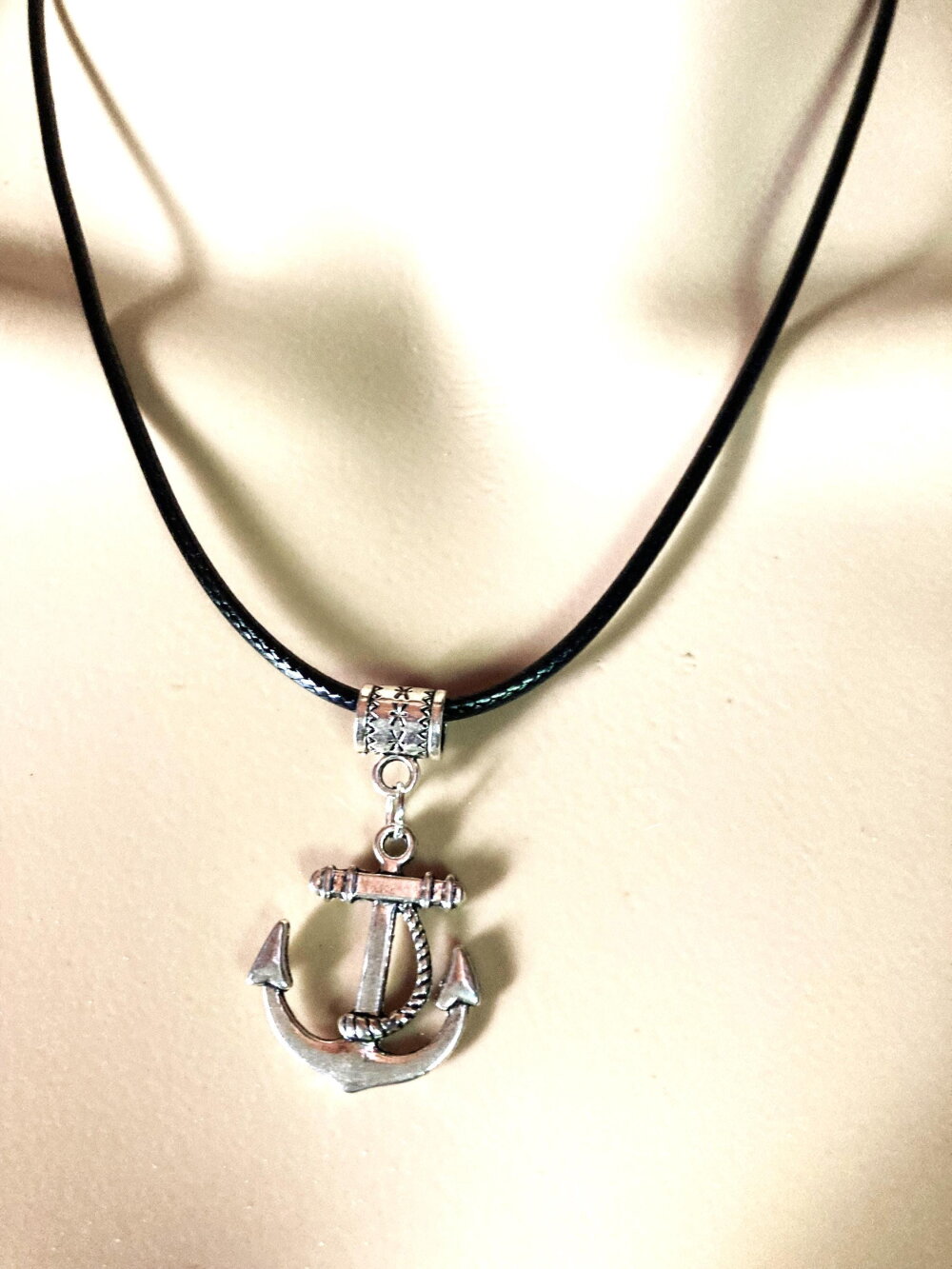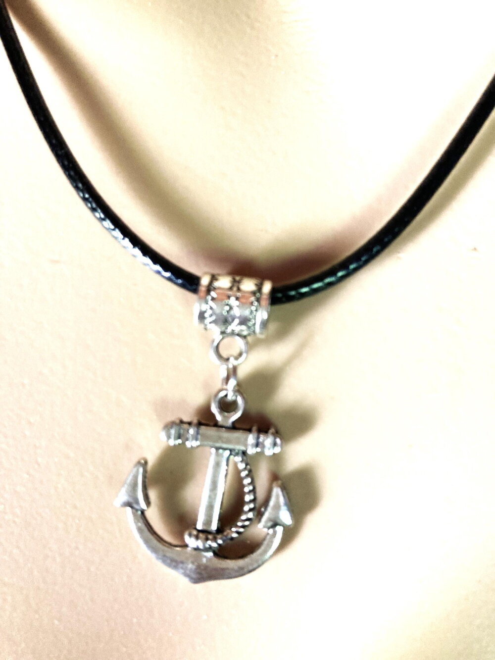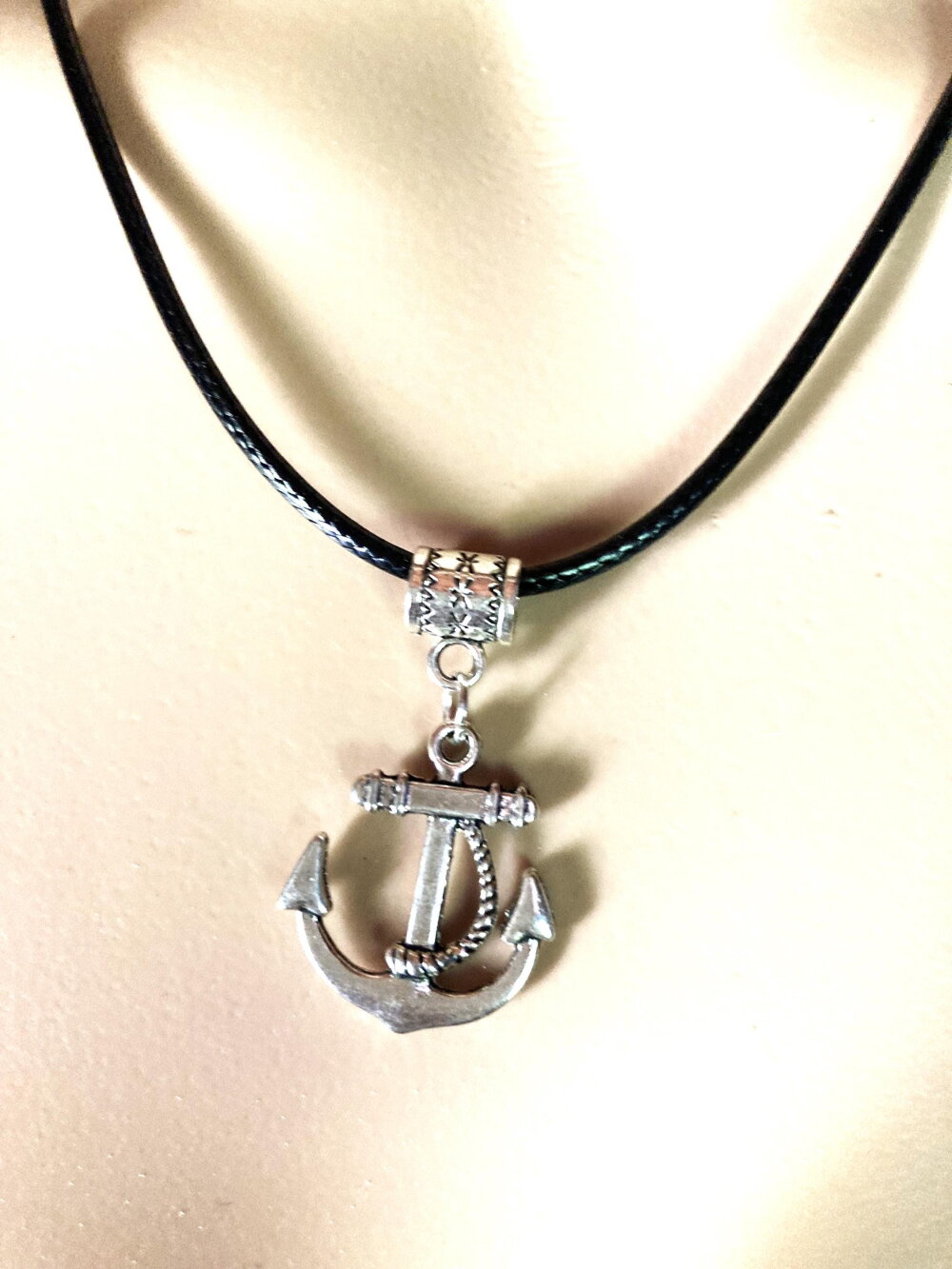 Très beau pendentif ancre de marine en métal argenté sur collier cordon en coton noir. Bijou homme femme.