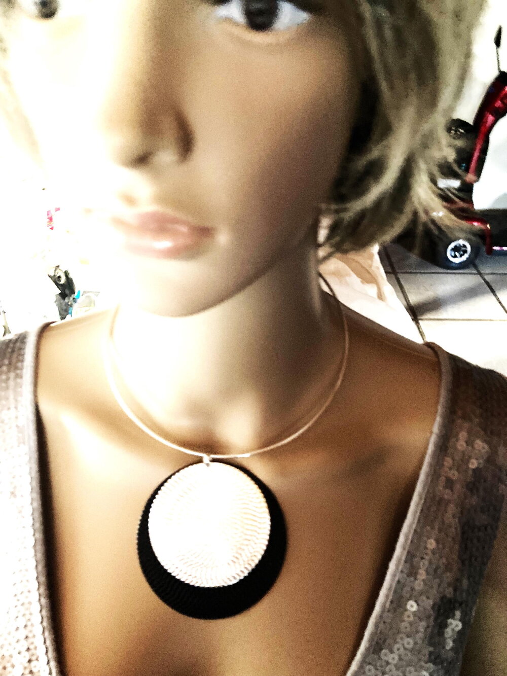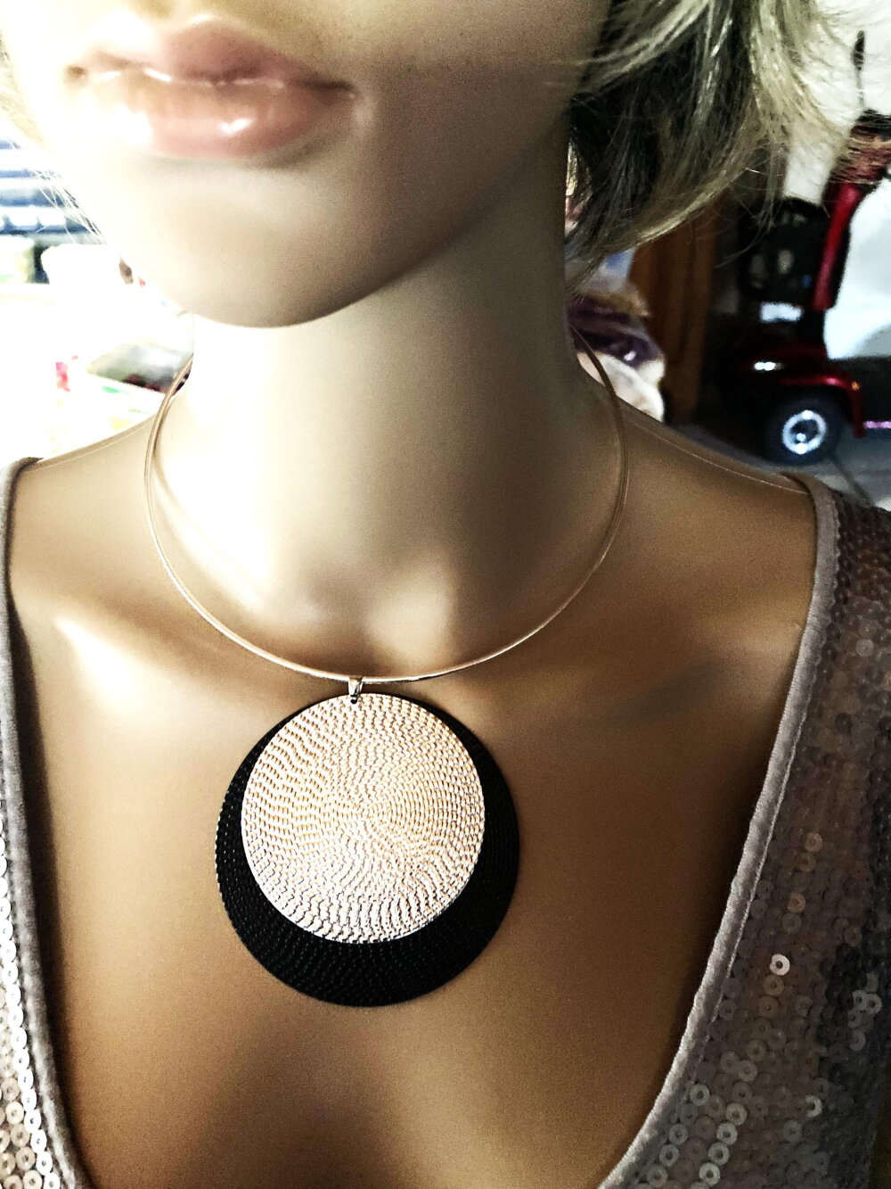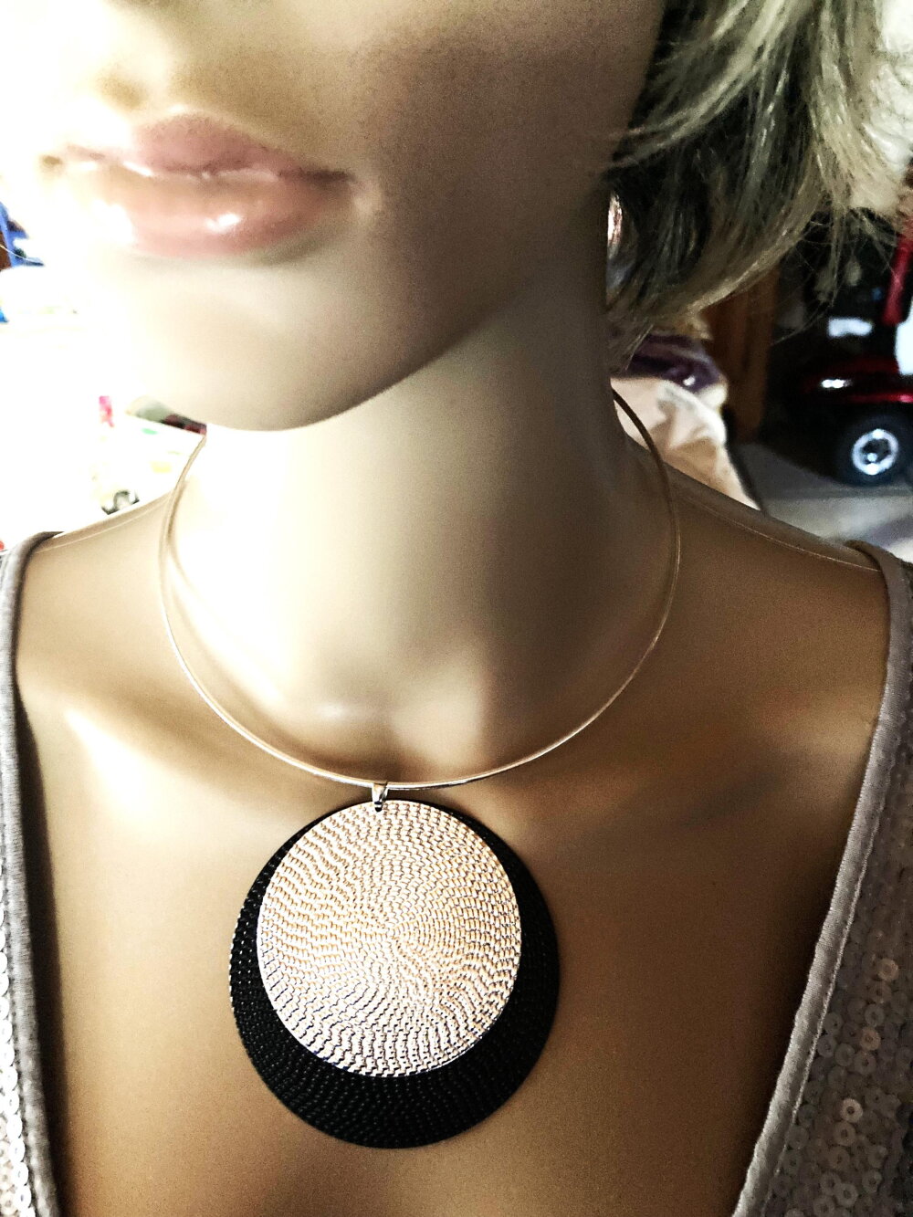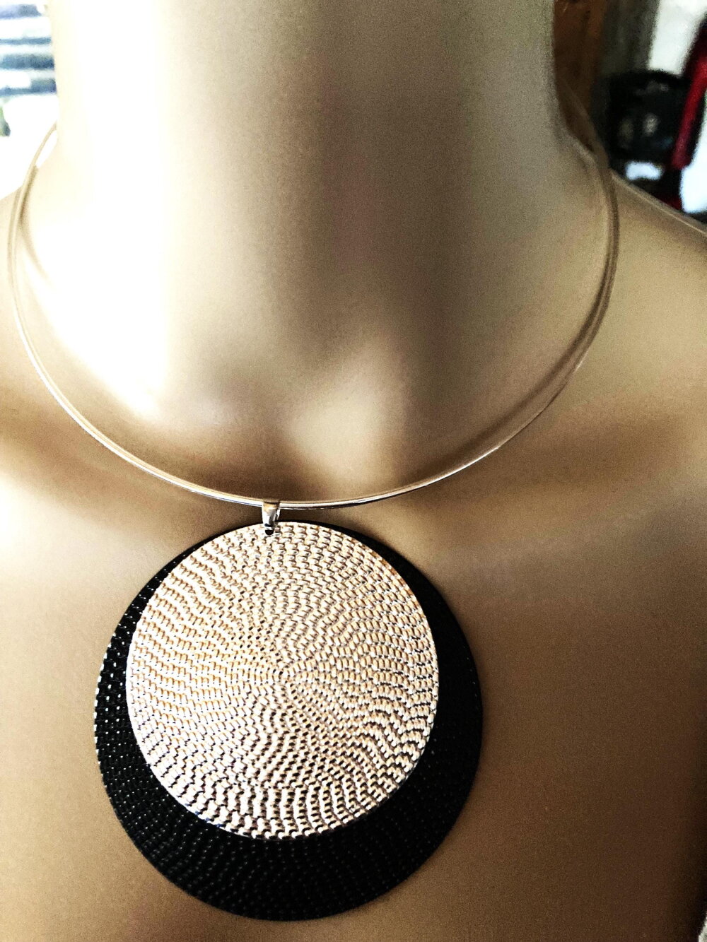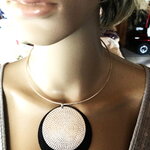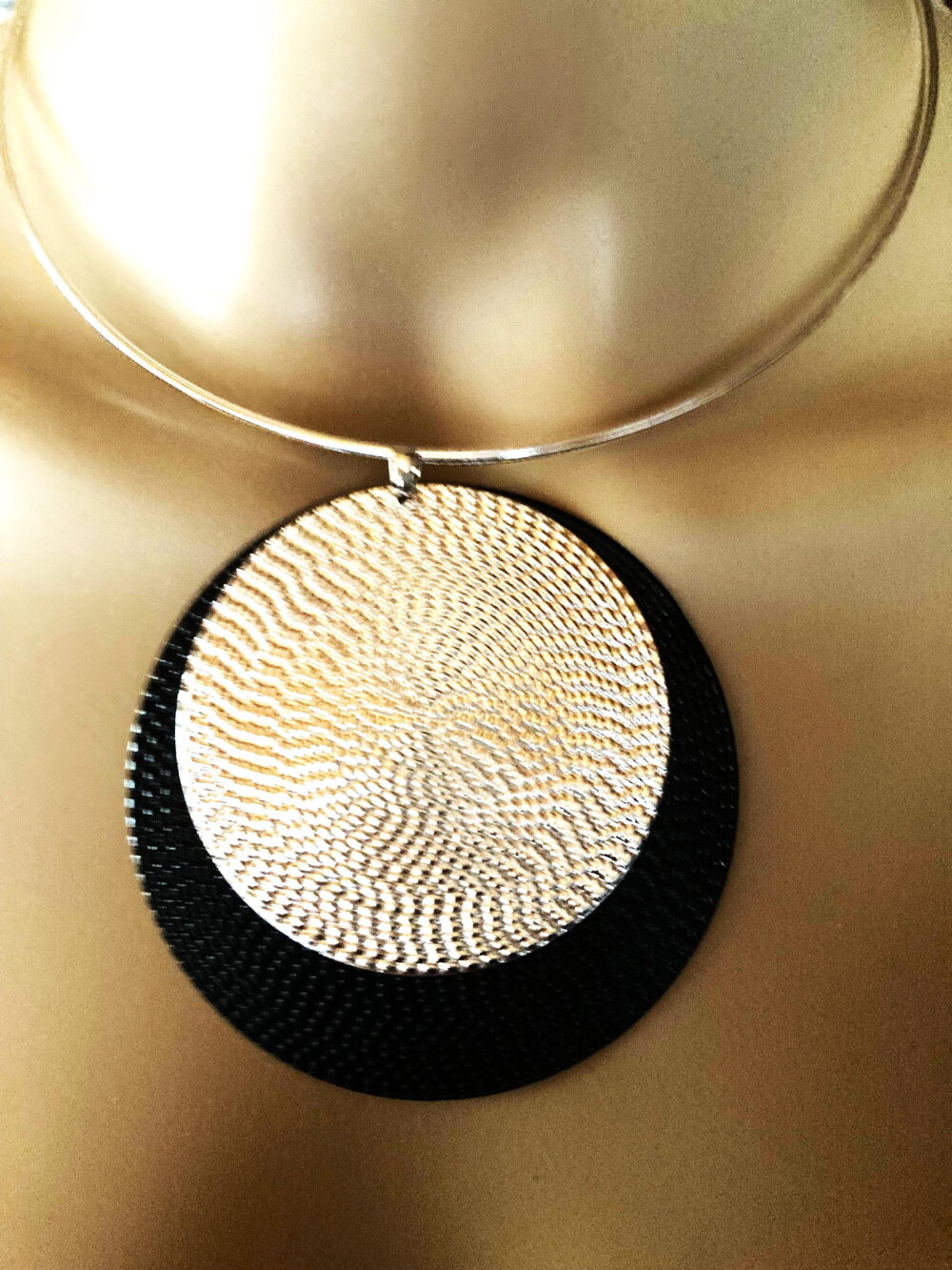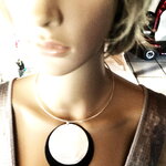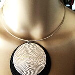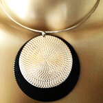 Très beau pendentif plat fin argenté et noir, sur collier cercle métal argenté ras de cou. Bijou femme.