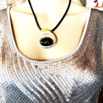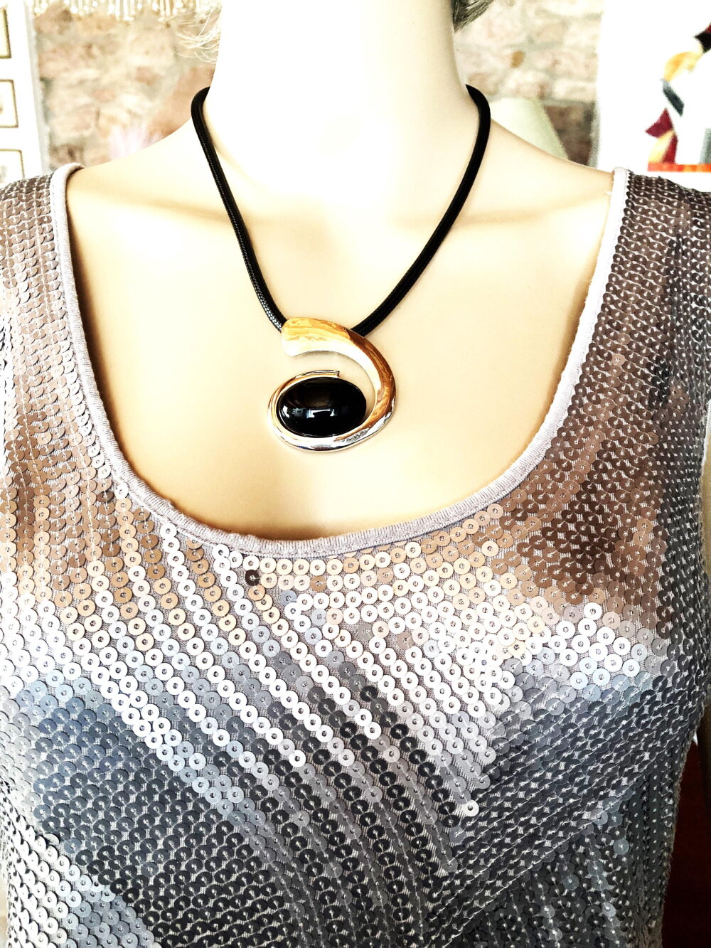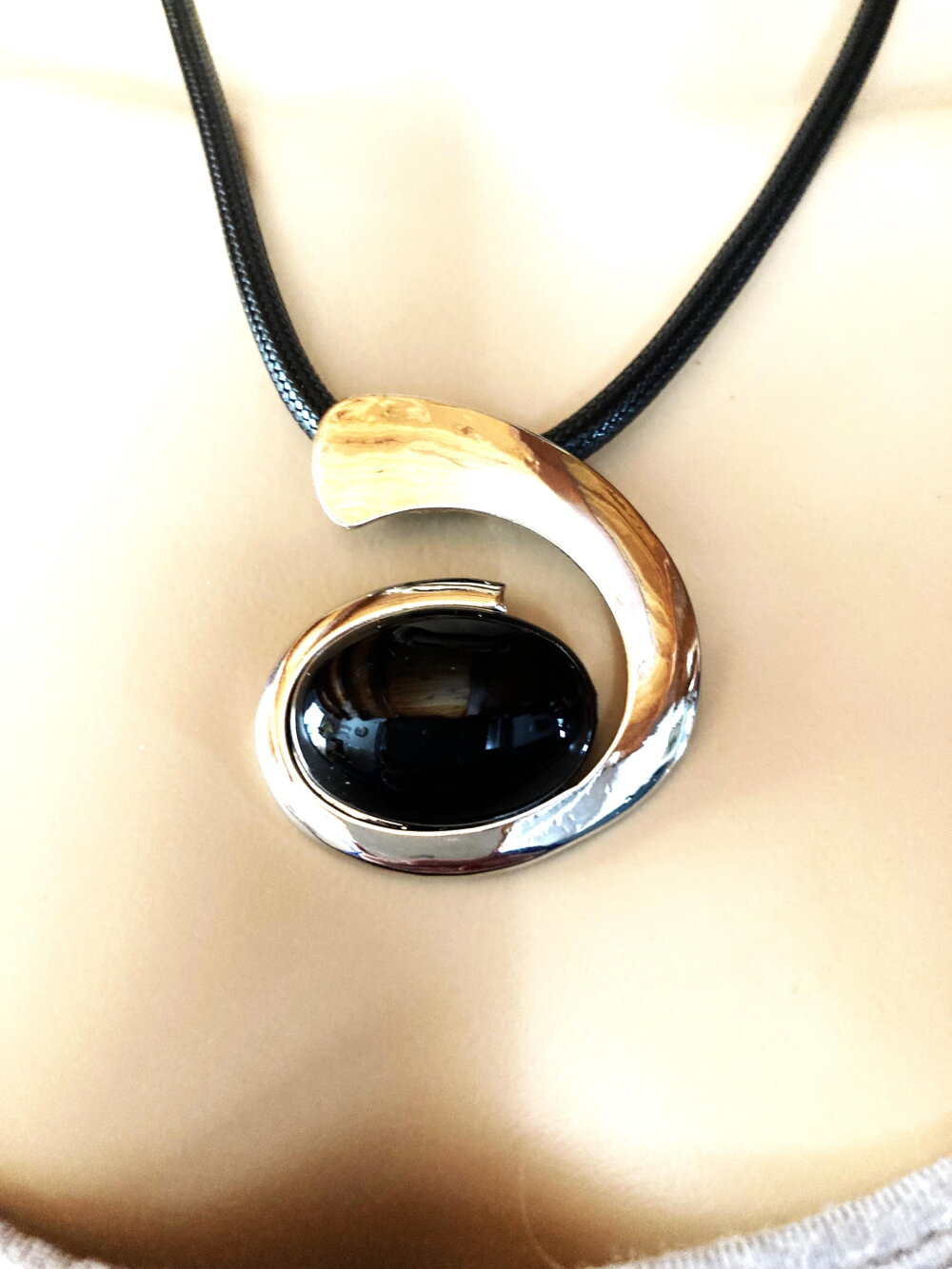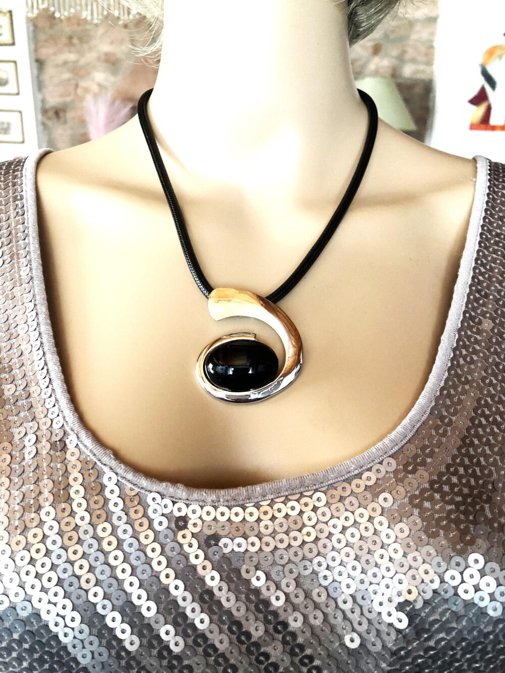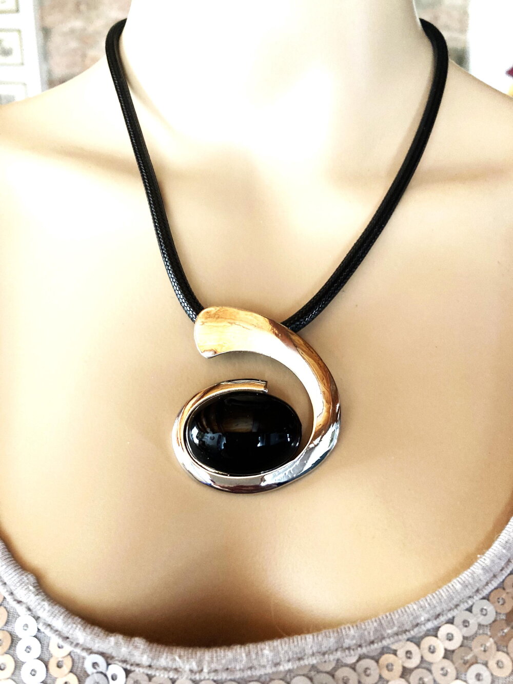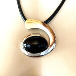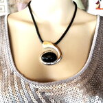 Très beau pendentif argenté et noir, très original, sur collier cordon réglable en coton noir. Bijou femme.